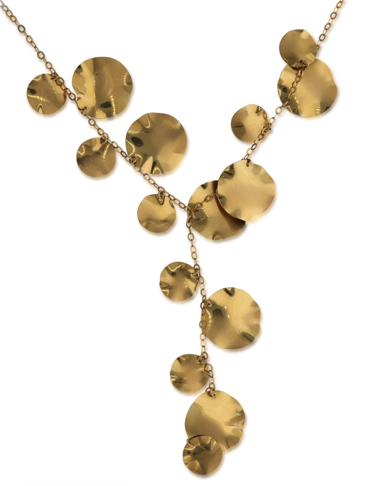 Composed of gold discs with a high-polish finish, suspended from a chain.