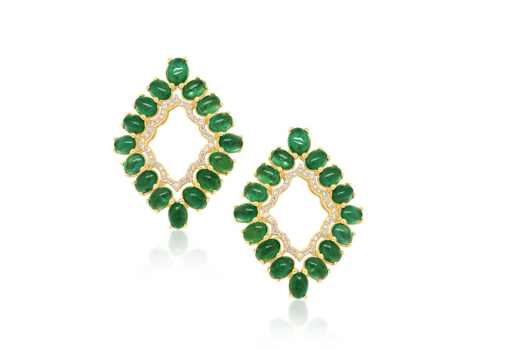 Designed in a kite shape, each set with 16 oval-shaped emerald cabochons, accented by round brilliant-cut diamonds.