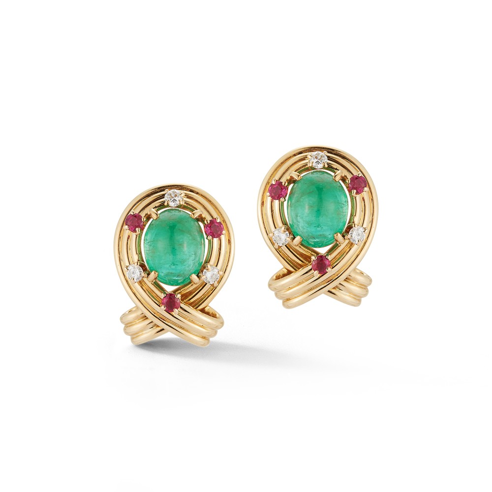Sculptural design, each set with oval cabochon emerald, surrounded by rubies and diamonds.