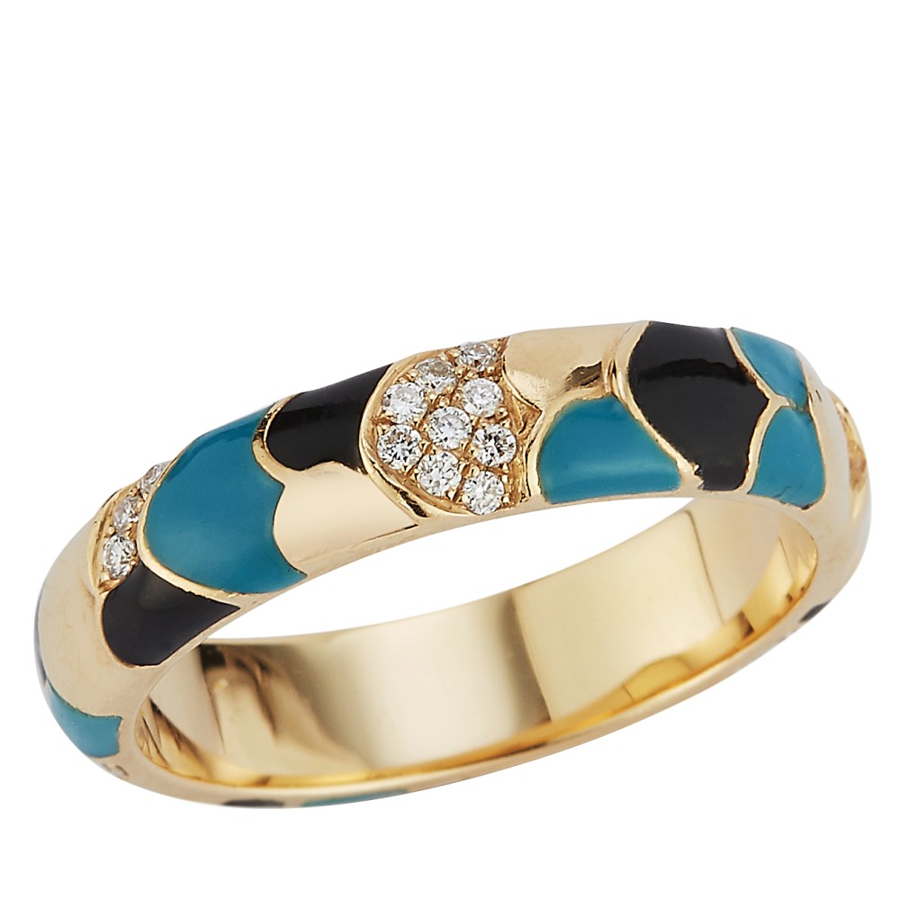 Composed with blue and black color enamel, accented by round diamonds.