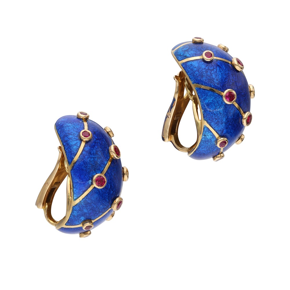 Composed of round-cut rubies and accented by transparent blue enamel.