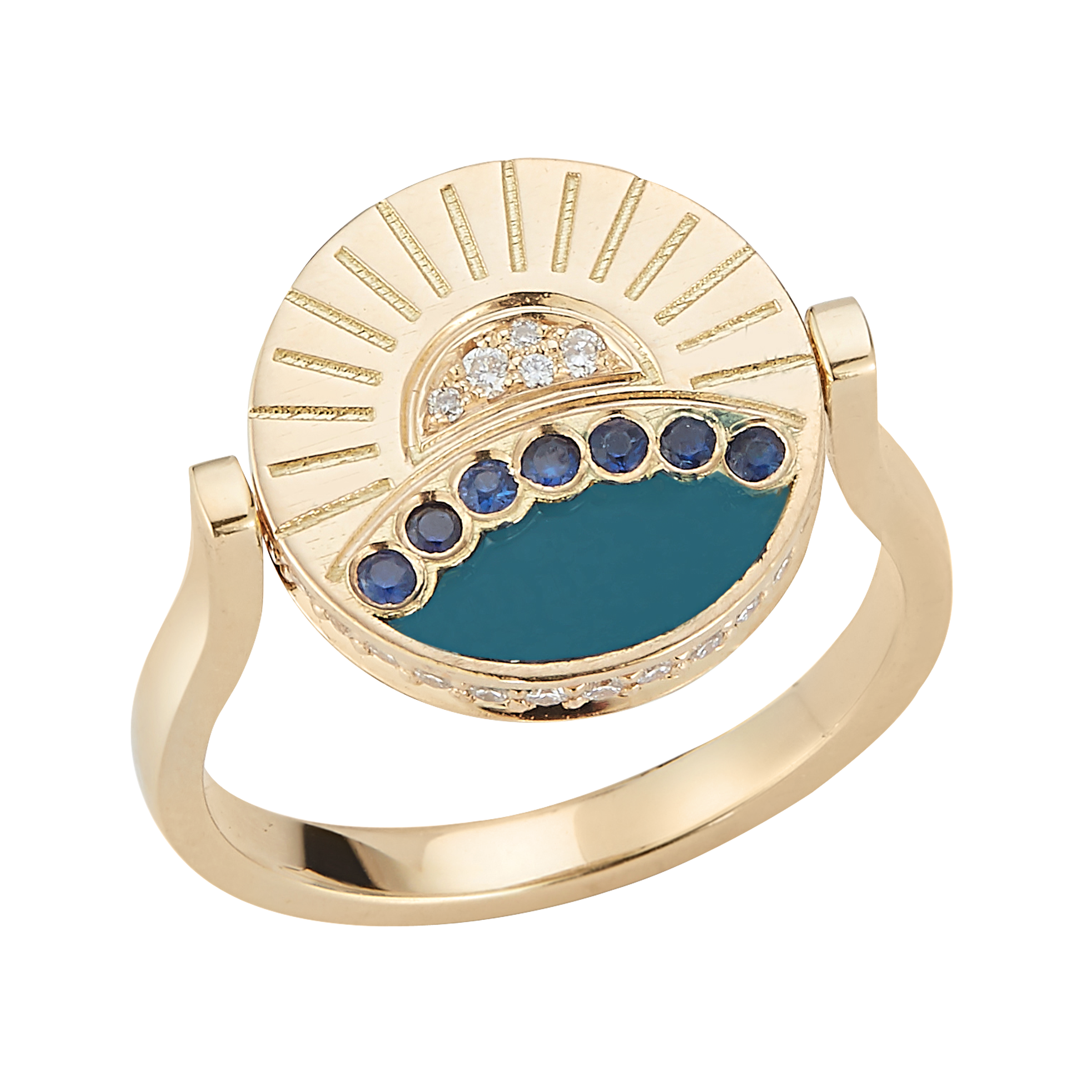Designed with nightscape and sunrise on both sides of the coin, accented by round diamonds, sapphires and enamel.