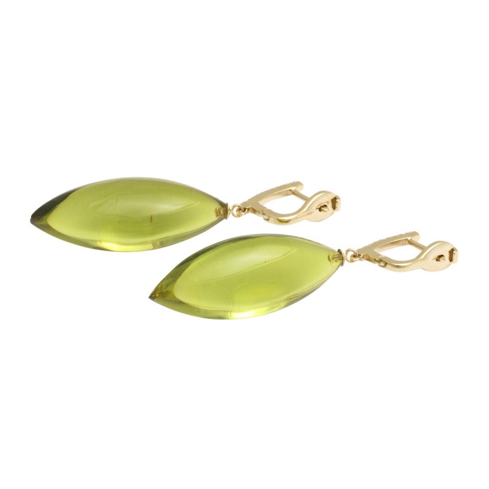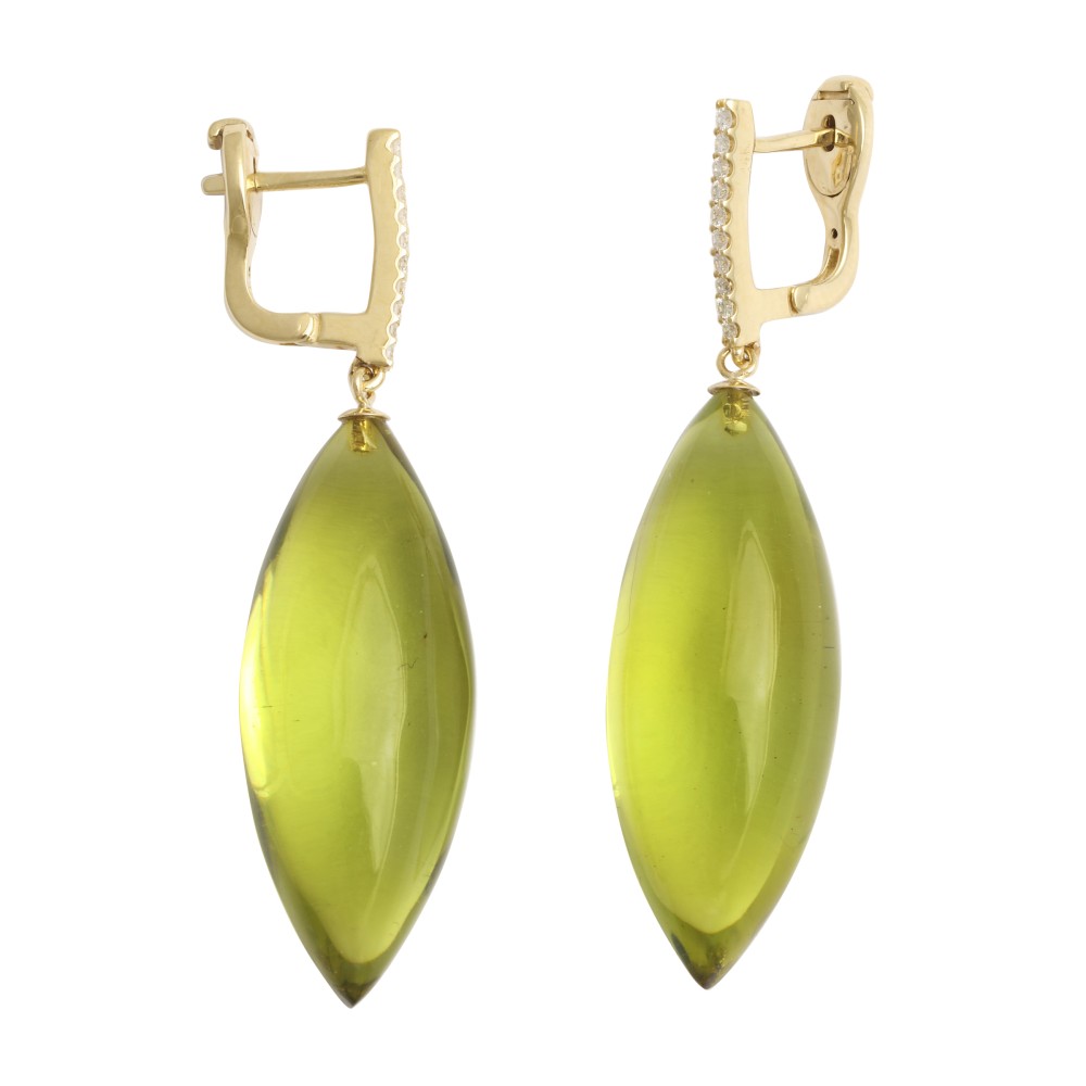 Featuring 2 olive-shaped green ambers, accented with round diamonds.