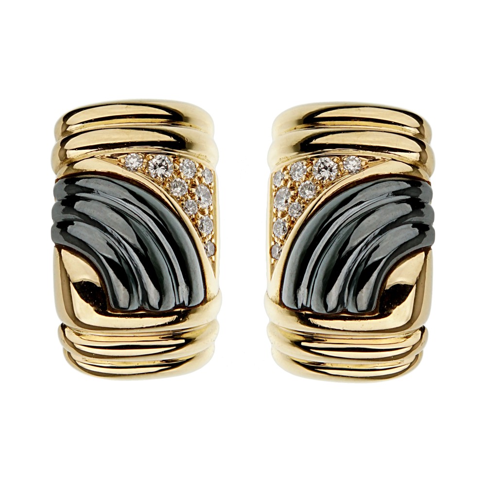 Composed of carved hematite and round diamonds.