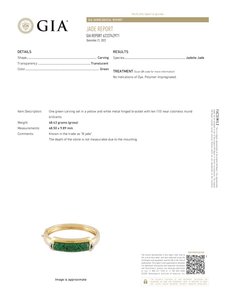 - Accompanied by GIA report no. 6223742971, dated 21 December 2022, stating that the jadeite jade shows no indications of dye and is polymer impregnated, “B” jade