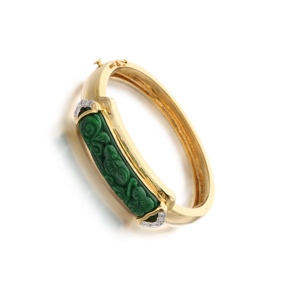Composed of carved jadeite jade and accented by round brilliant-cut diamonds.