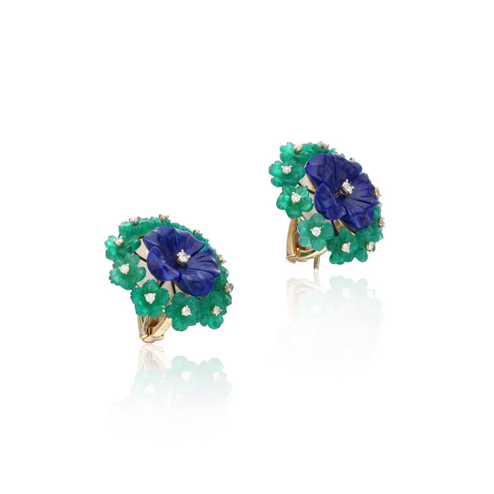 Set with carved lapis lazuli and green agate in flower design, accented by 22 round diamonds.