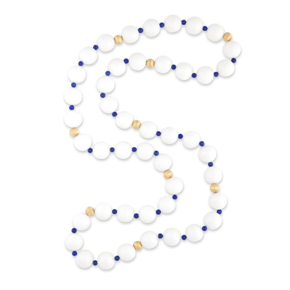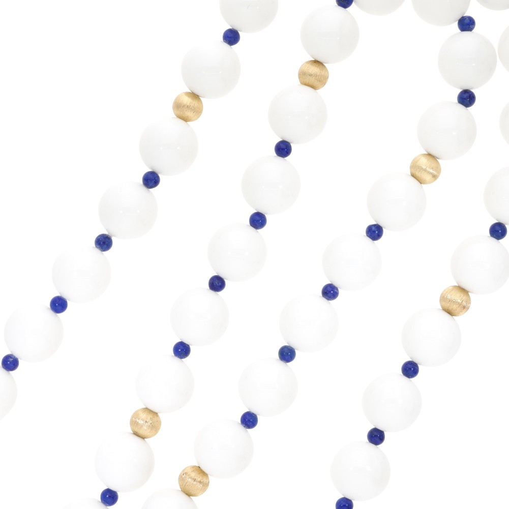 Composed of lapis lazuli and white agate beads interspaced by gold beads.