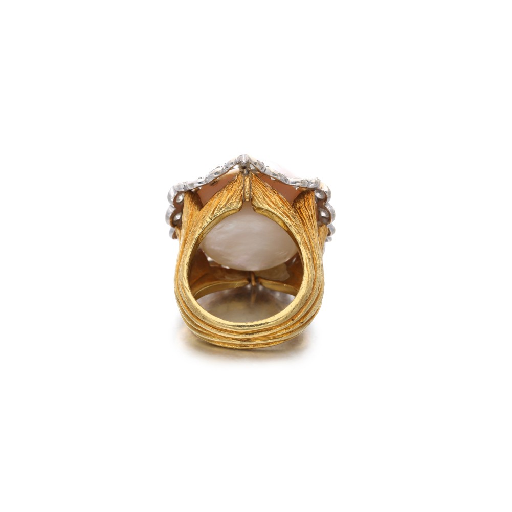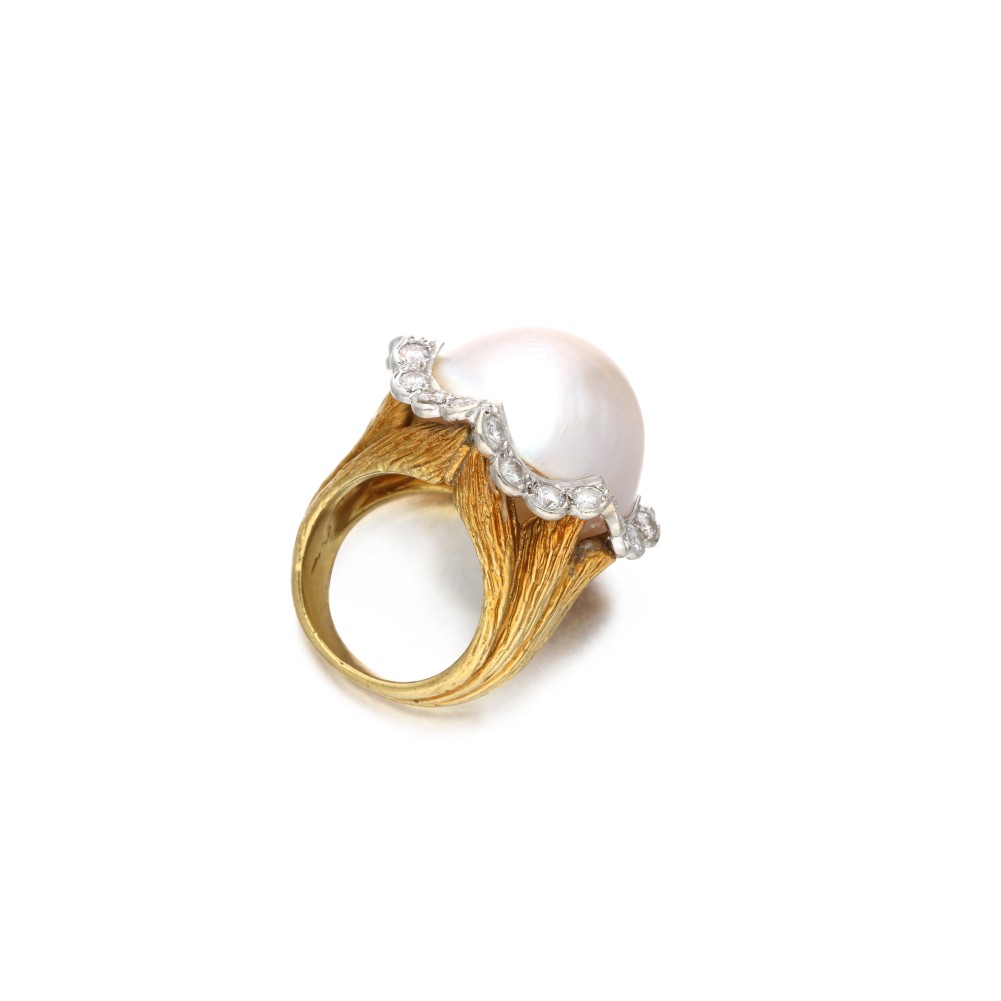 Centering a mab? pearl, surrounded by round brilliant cut diamonds.