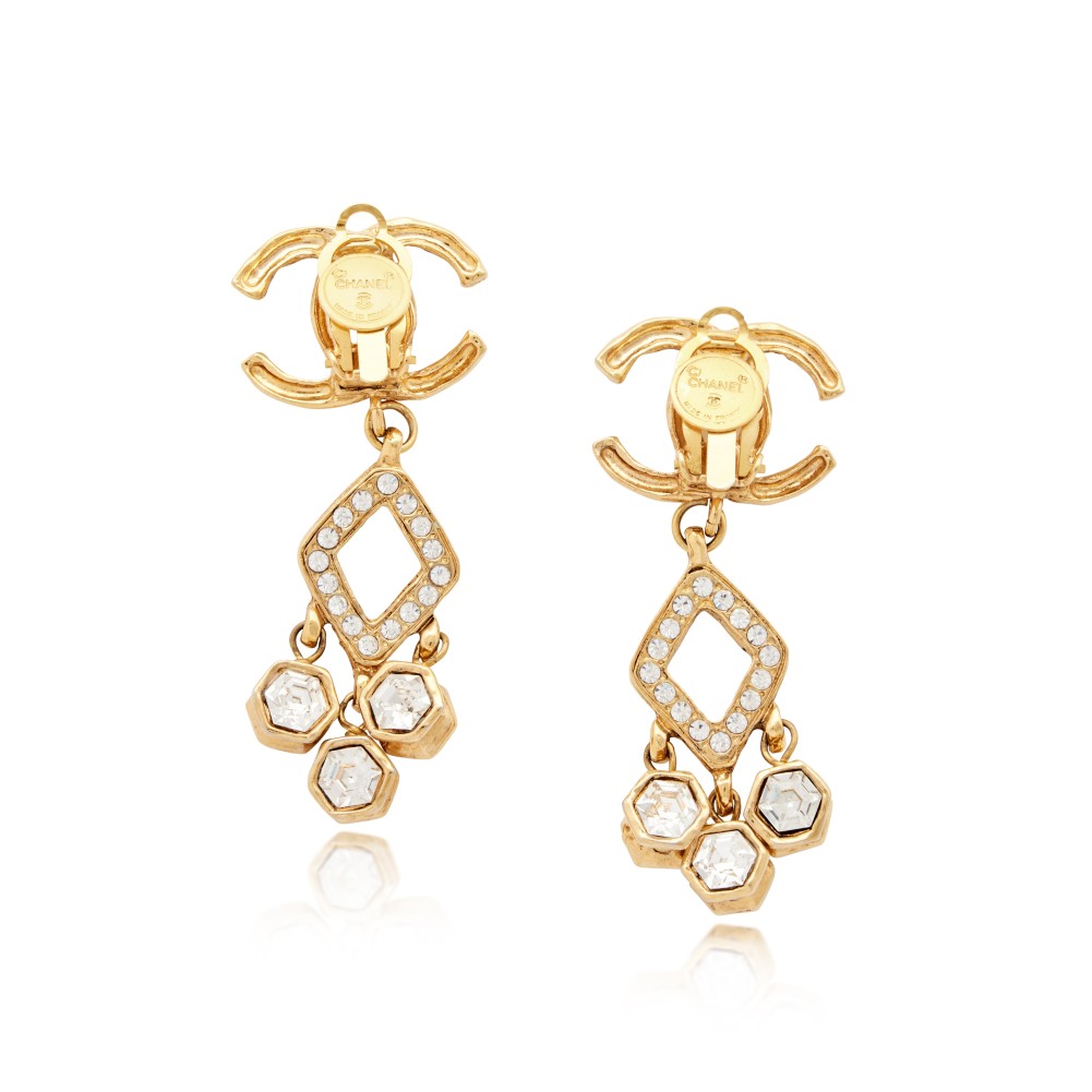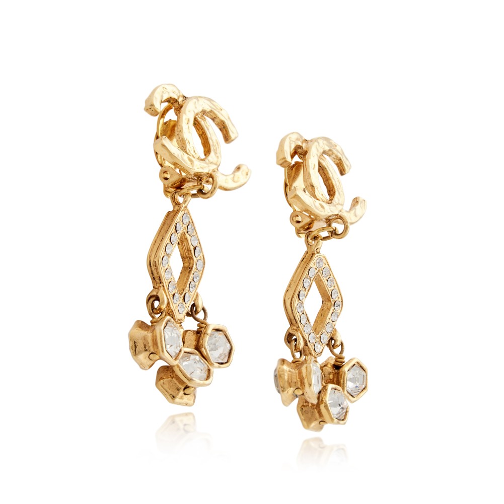 Chanel Gold Metal and Strass CC Drop Earrings, 1980s