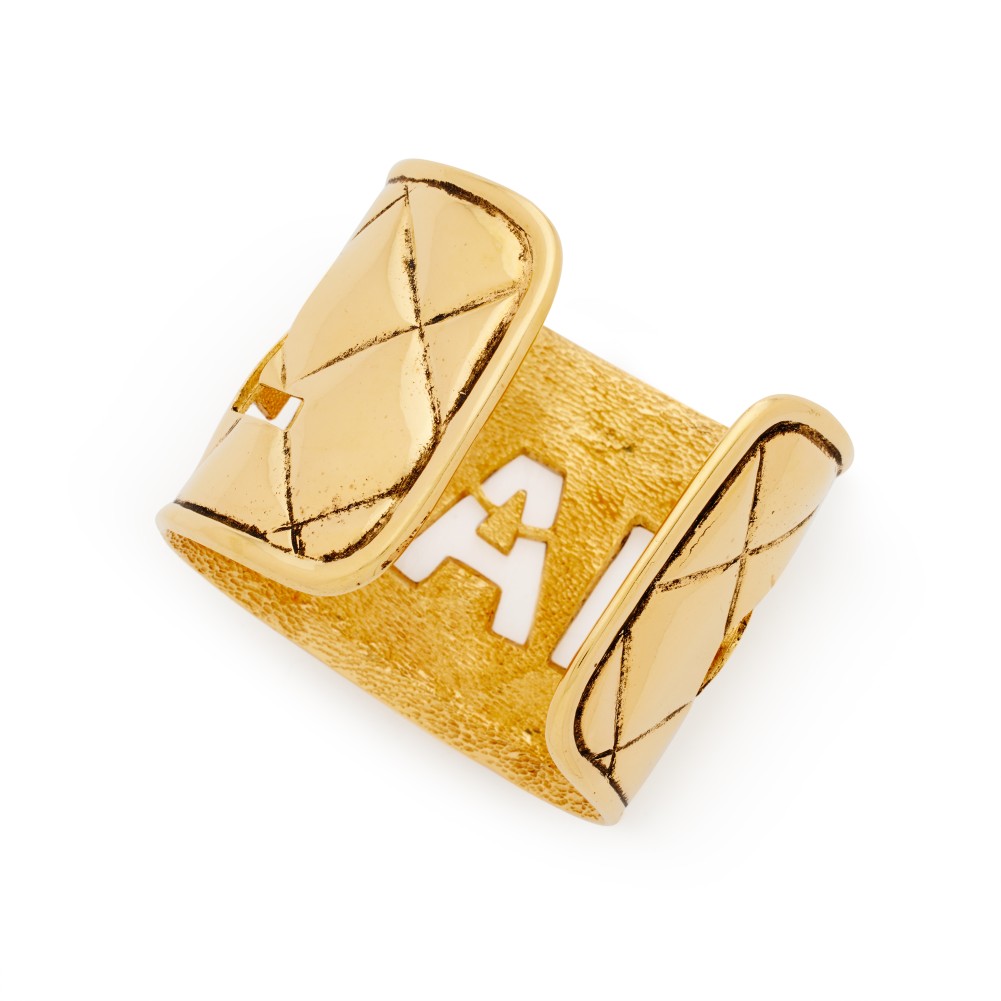 Chanel Gold Metal Quilted Cut Out Logo Statement Cuff, 1980s