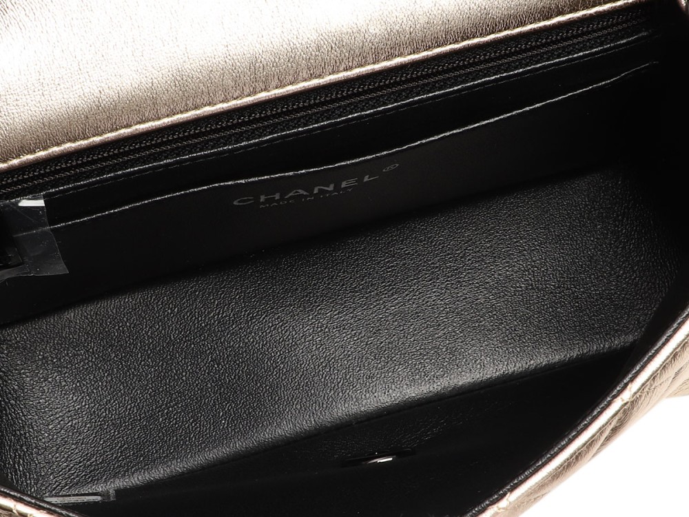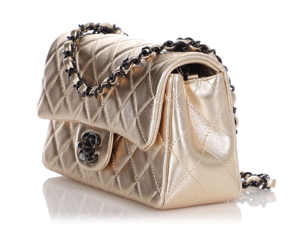 Chanel Gold Metallic Quilted Lambskin Mini Rectangular Classic Flap Black Hardware, 2021