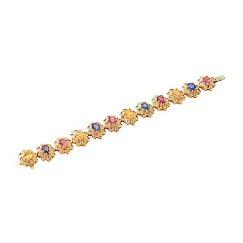 The floral bracelet set with rubies and sapphires of various hues, accented by round diamonds.