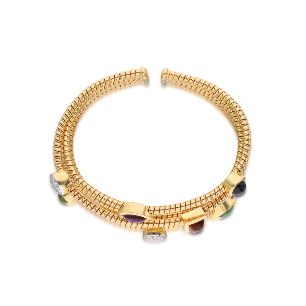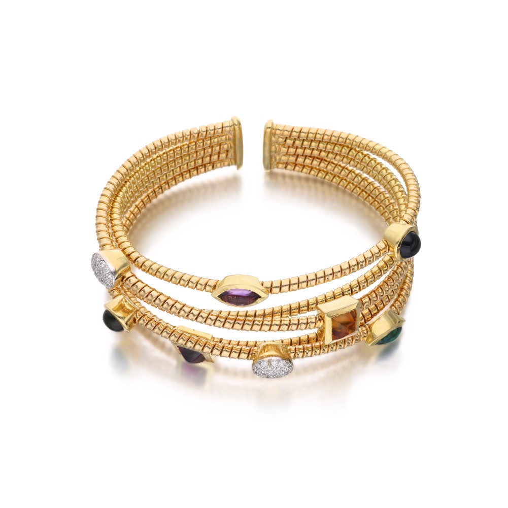 Composed of citrine, tourmaline, garnet and iolite cabochons accented by full cut diamonds.