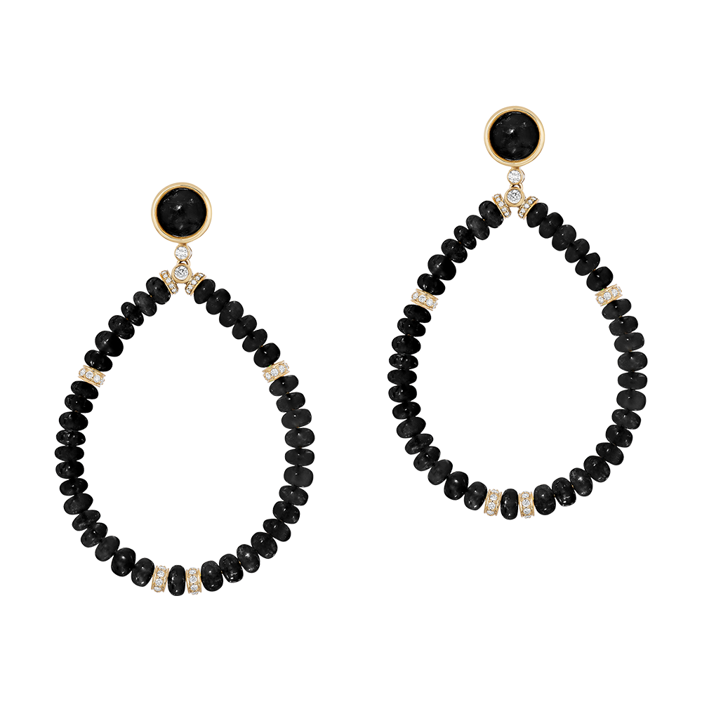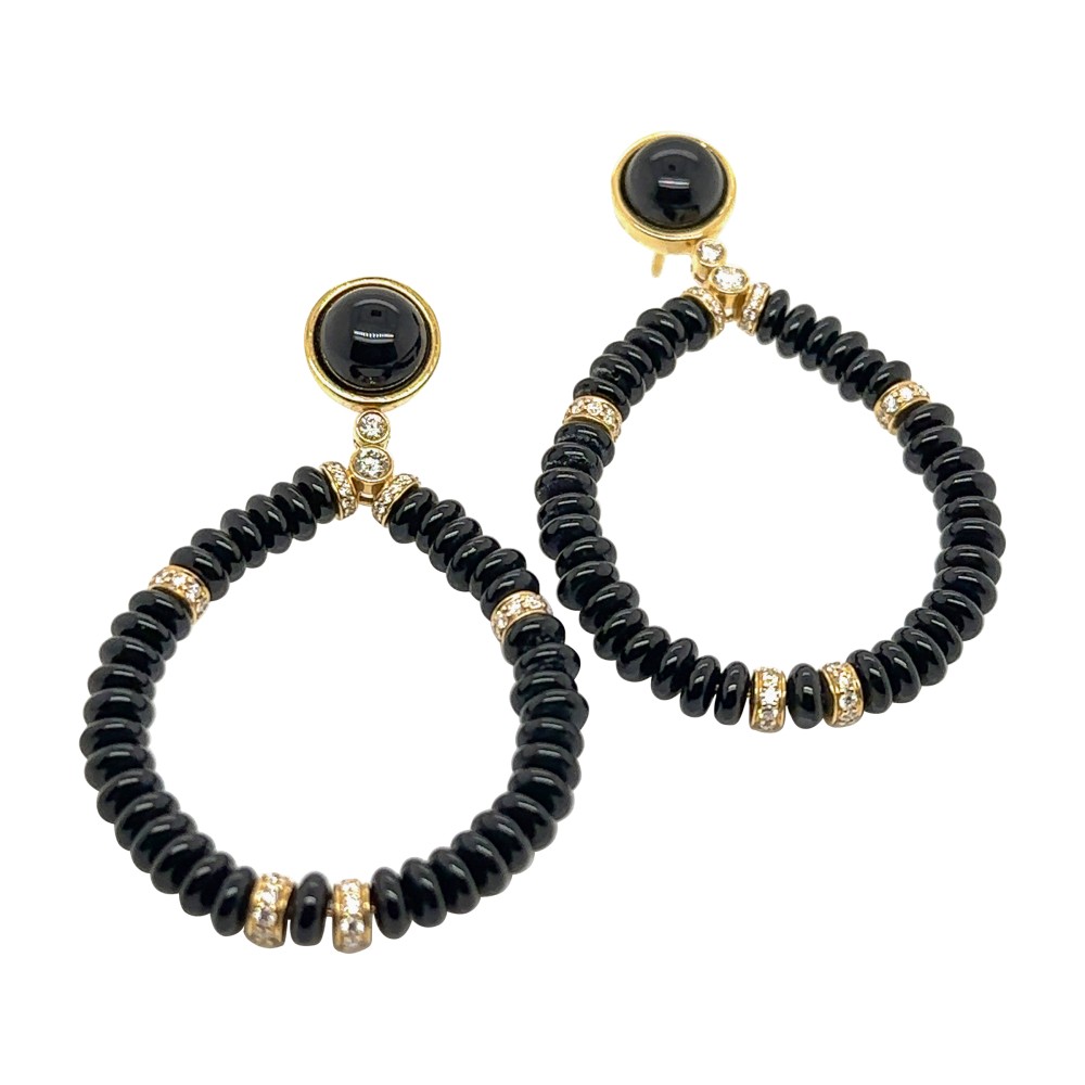 Set with a bezel-set round onyx cabochon on each, suspended by onyx rondelles in a pear shape, accented by round diamonds.