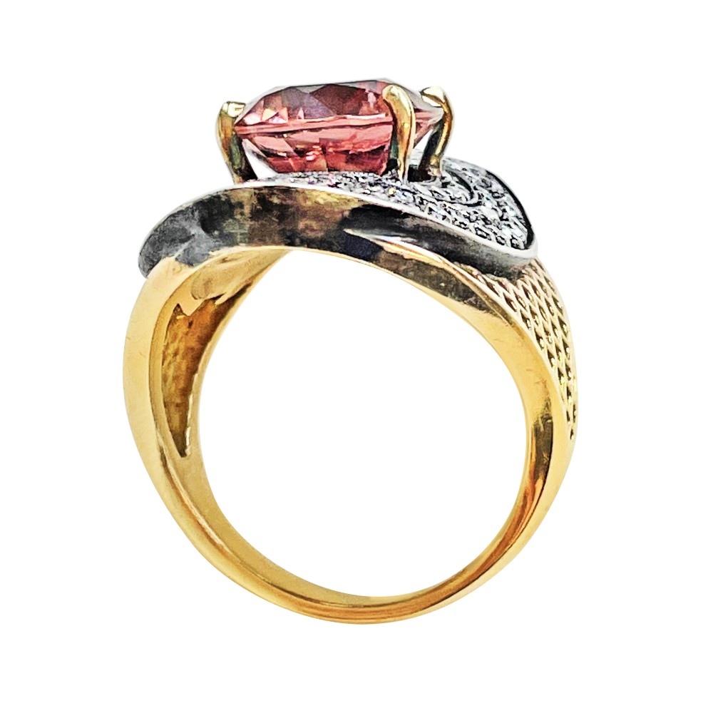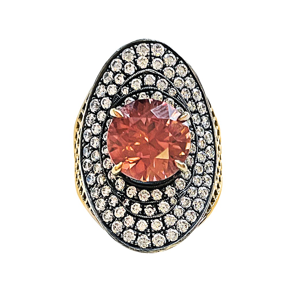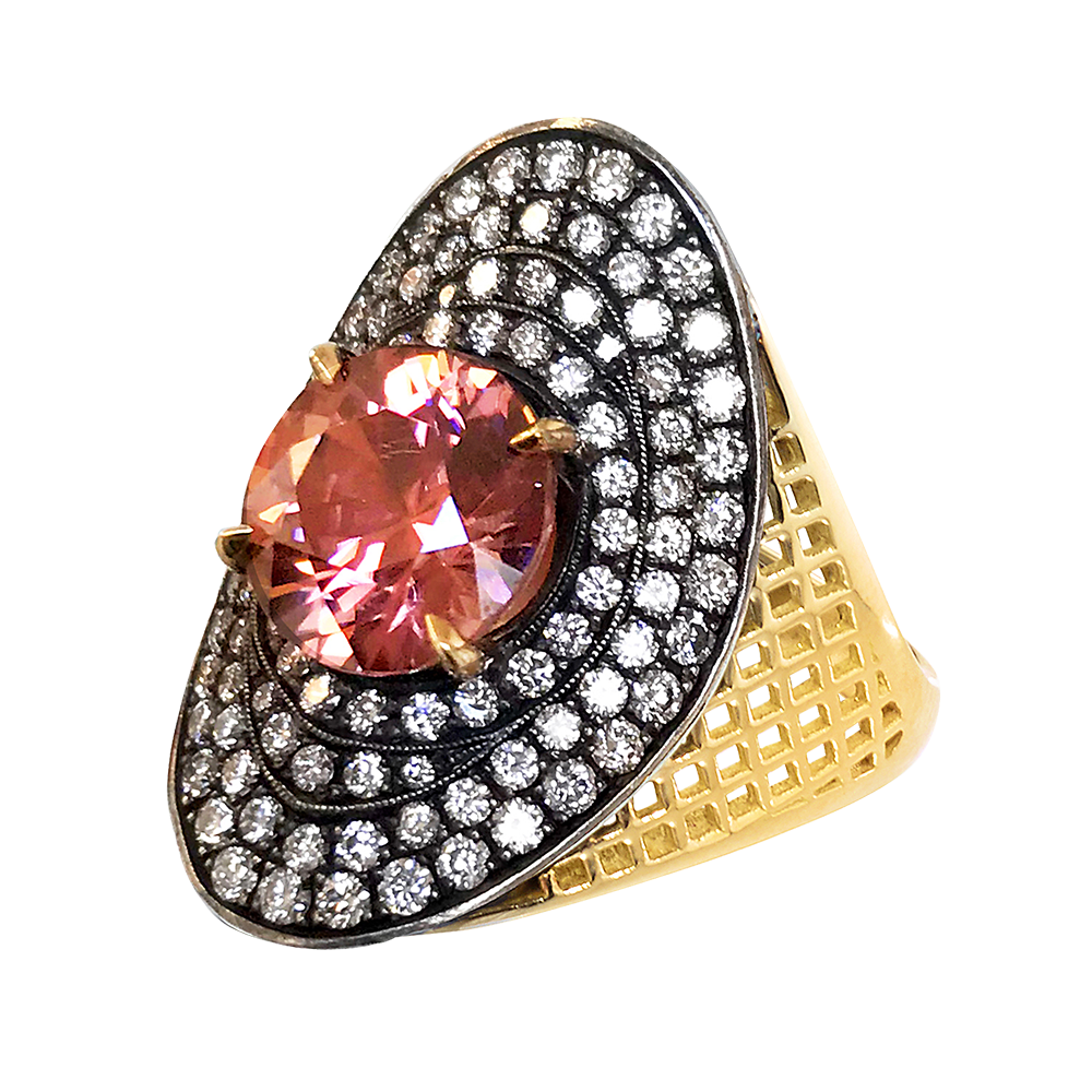 Centering a round pink zircon with signature crownwork pattern design, surrounded by round diamonds.