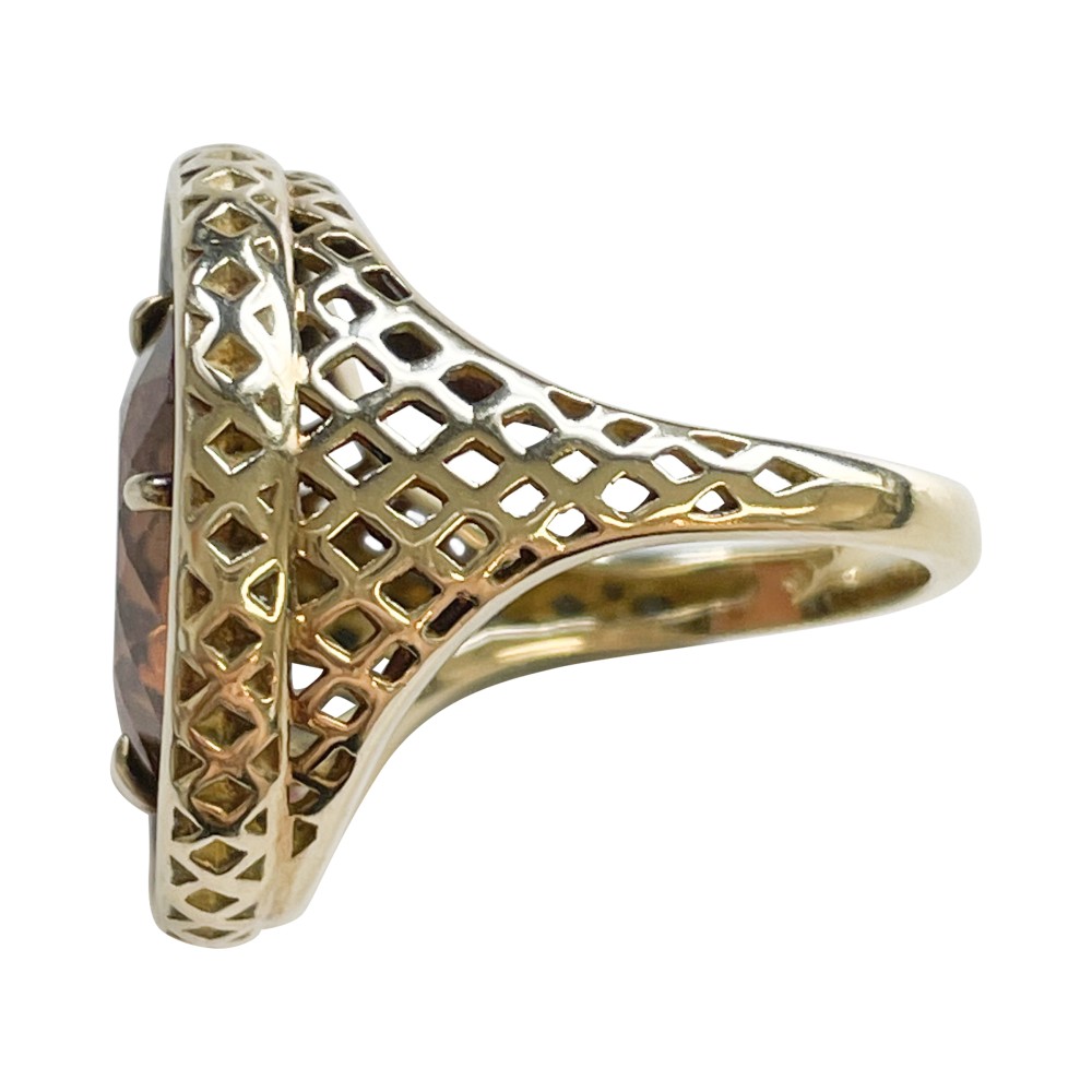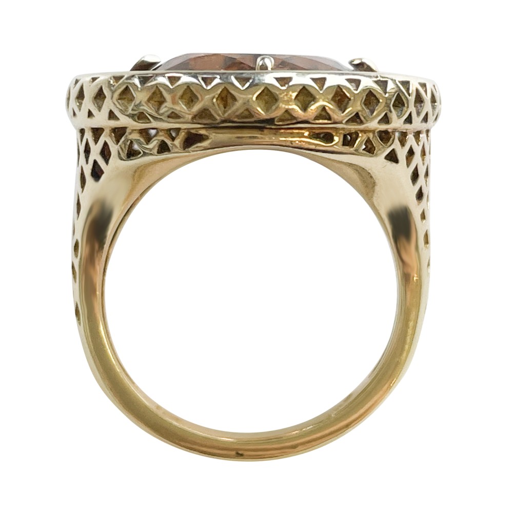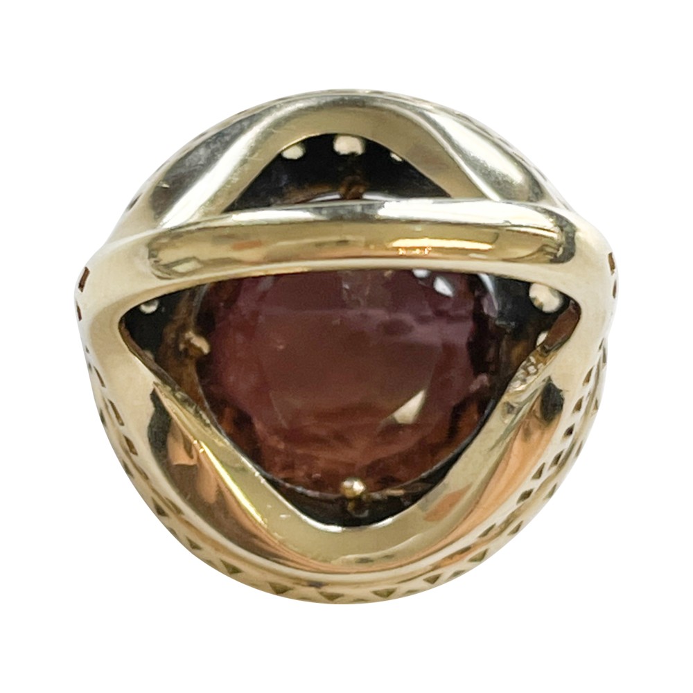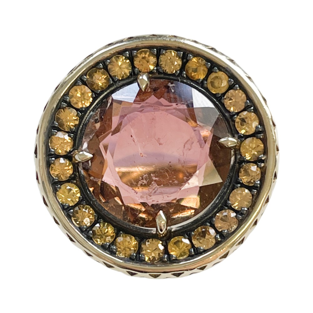 Centering a round tourmaline, surrounded by round diamonds with signature grid-like pattern design.