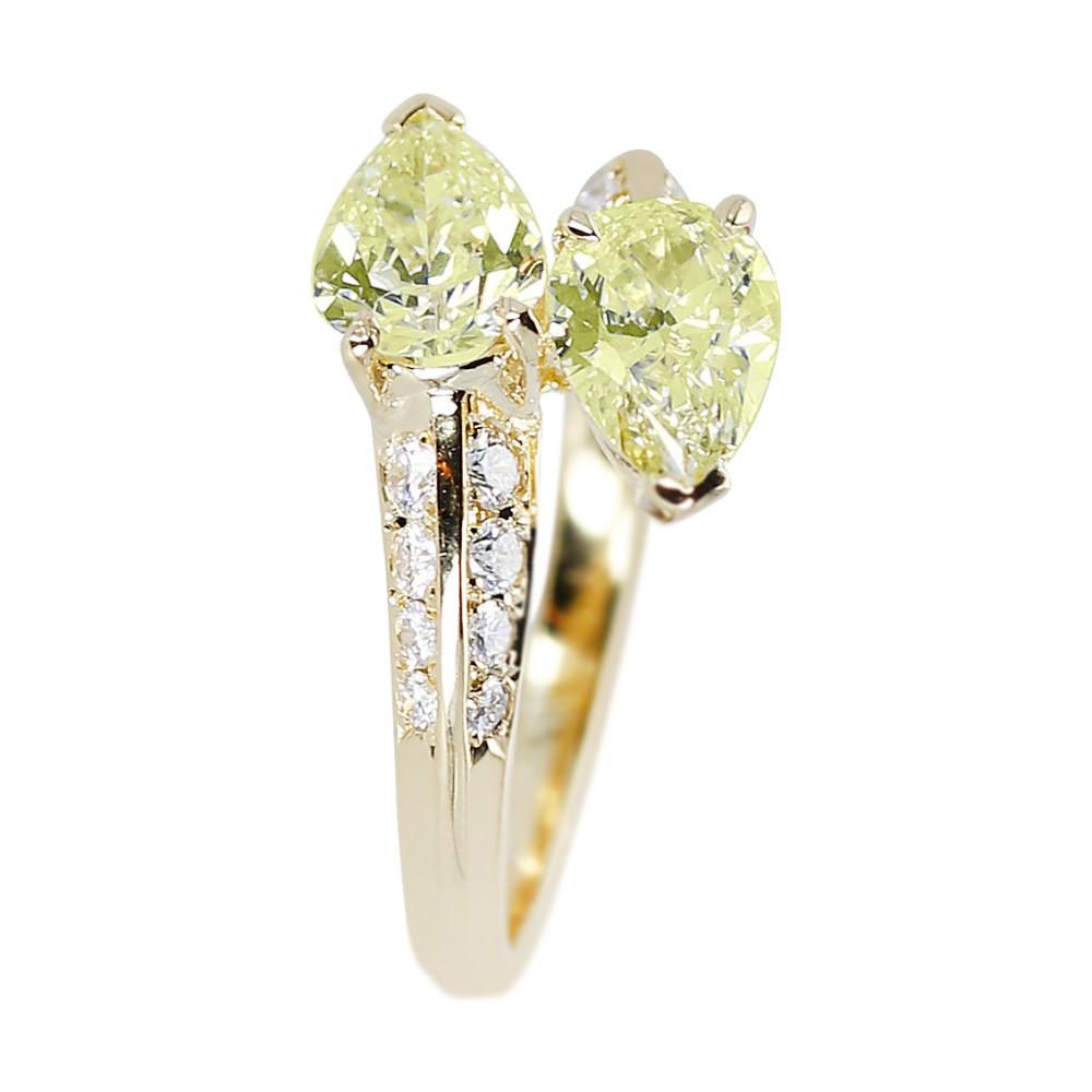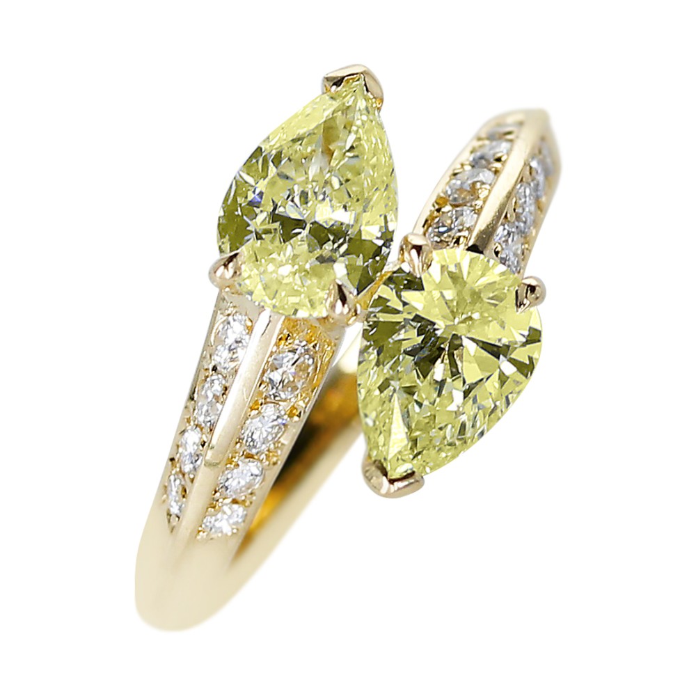 Of bypass design, featuring 2 pear-shaped yellow diamonds, accented by round diamonds.