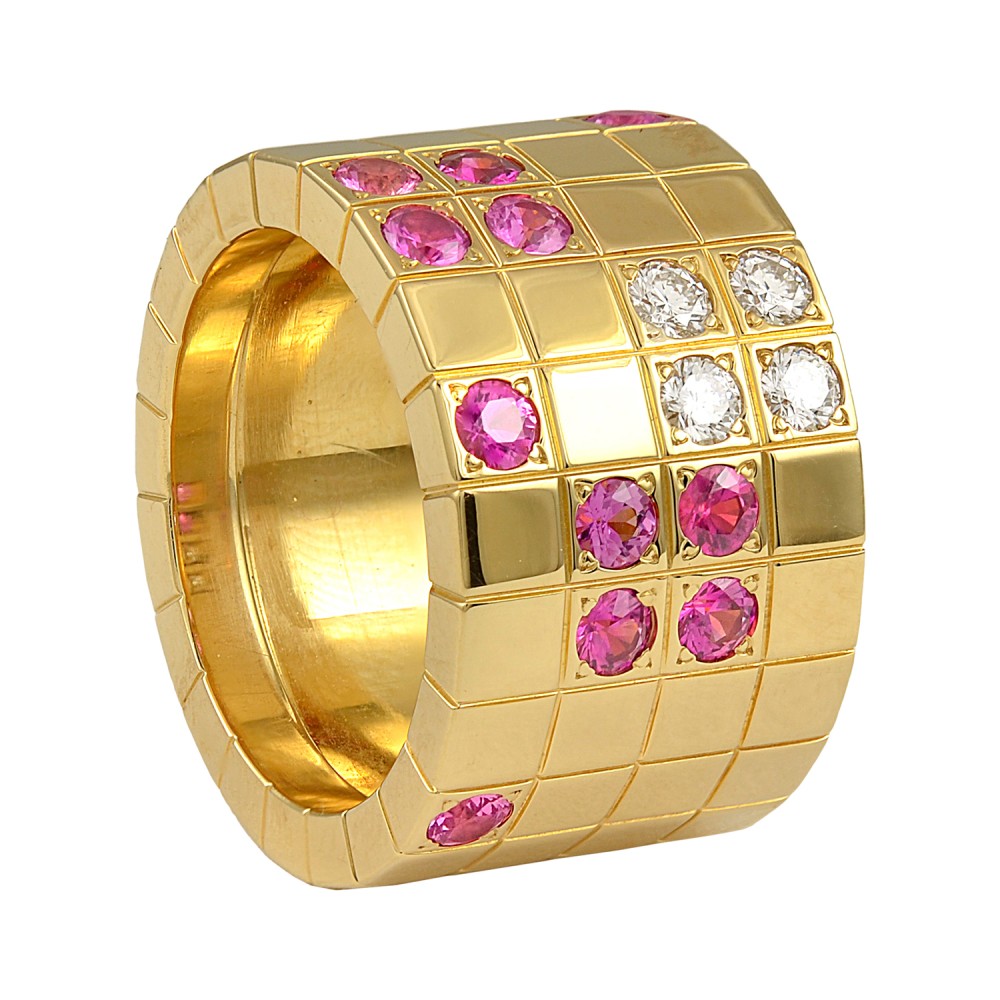 Featuring a checkerboard pattern, set with round pink sapphires and round diamonds.
