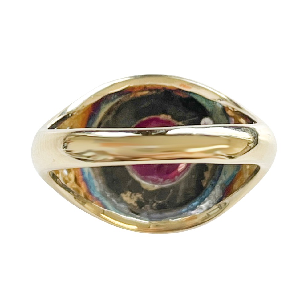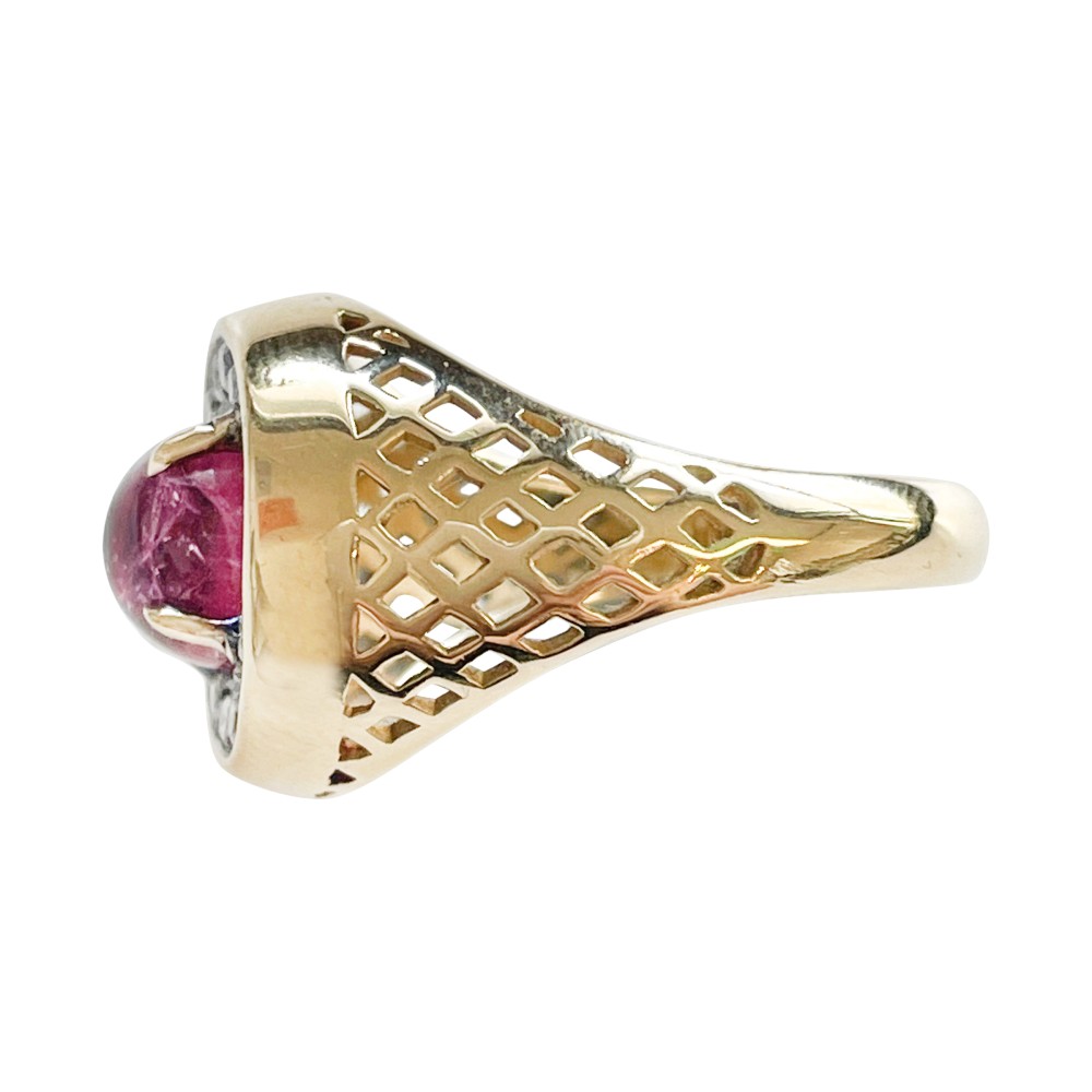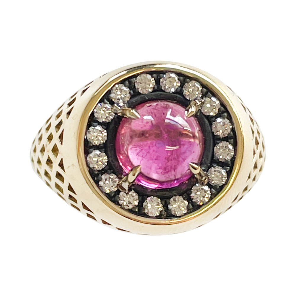 Set with a round pink tourmaline cabochon, surrounded by round diamonds with signature grid-like pattern design.
