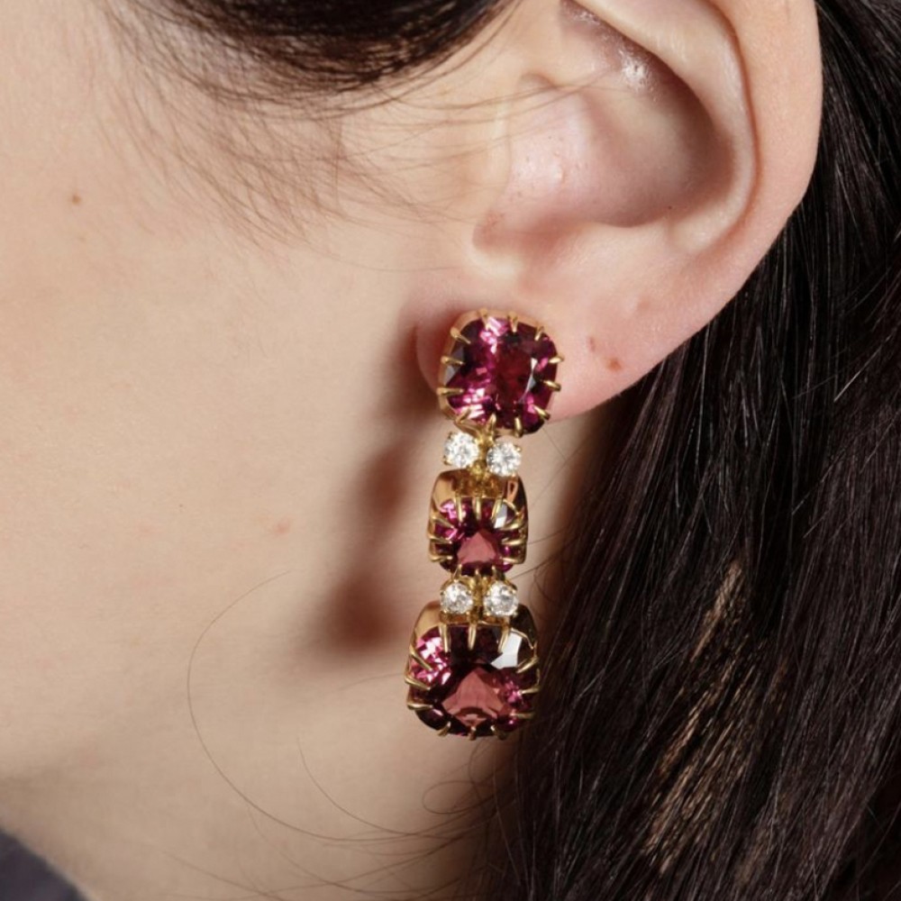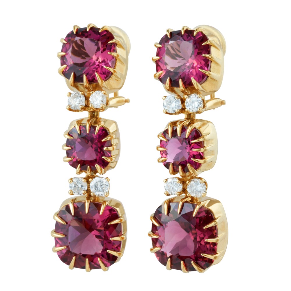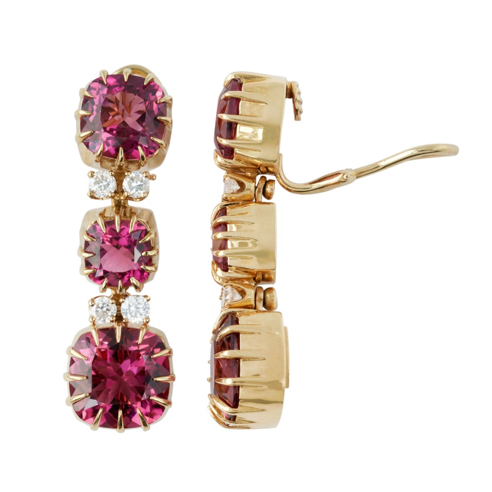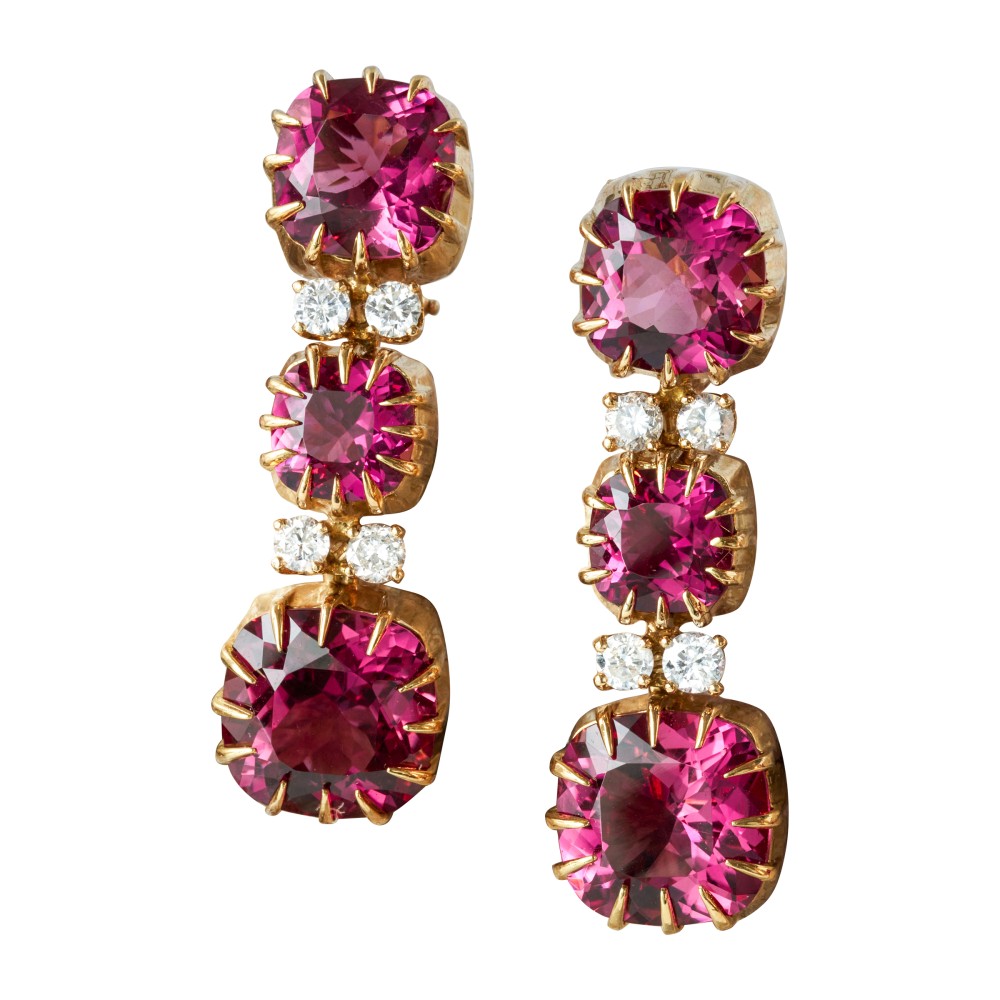 Featuring cushion-shaped pink tourmalines, accented by round brilliant-cut diamonds.