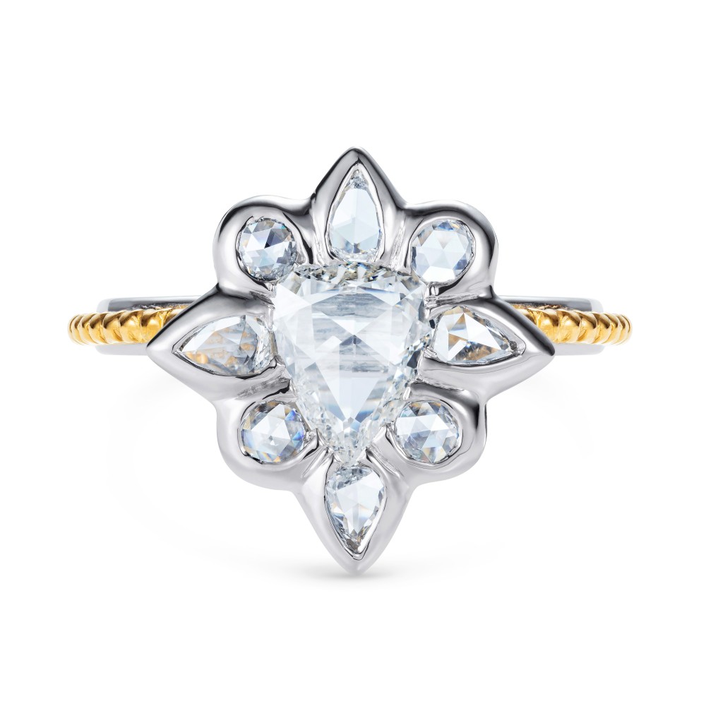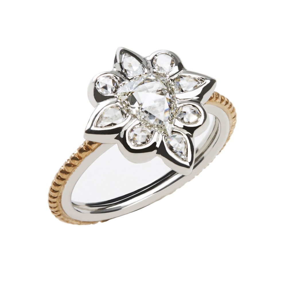 Featuring a central rose-cut diamond surrounded by 4 pear-shaped cut diamonds alternating with 4 round rose-cut diamonds mounted on a rope gold and platinum band.