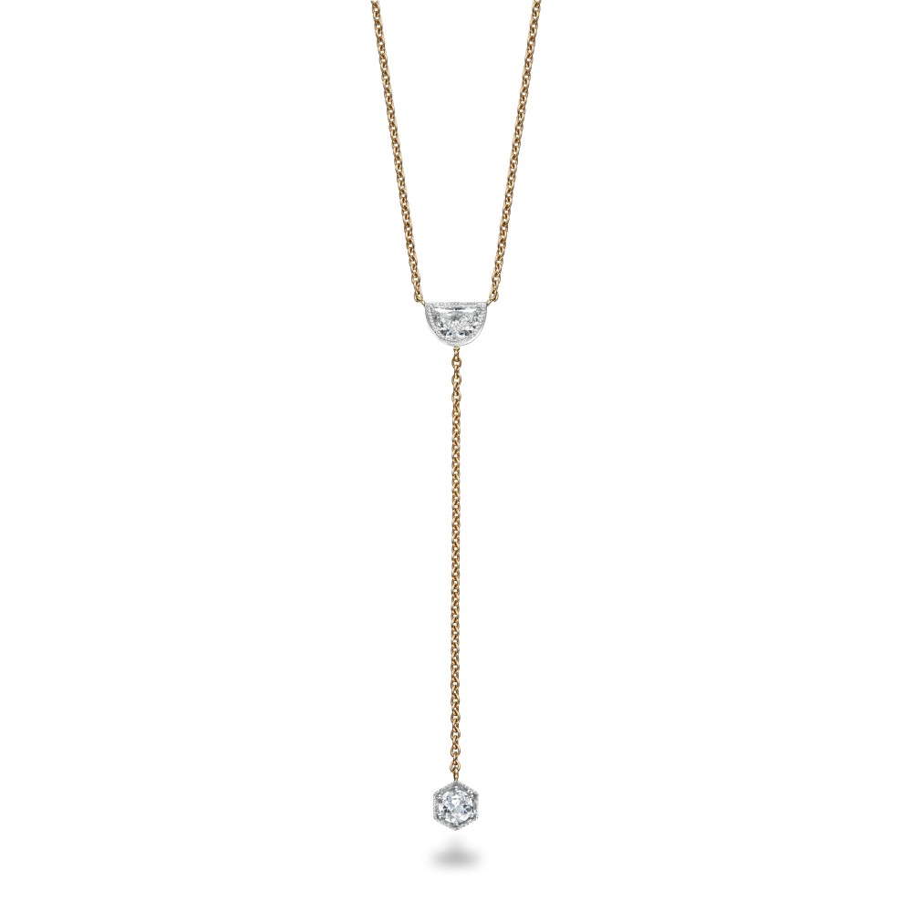 Inspired by the Art Deco period, both diamonds are set in millgrain detail and the old-cut diamond is set in a hexagonal honeycomb frame.