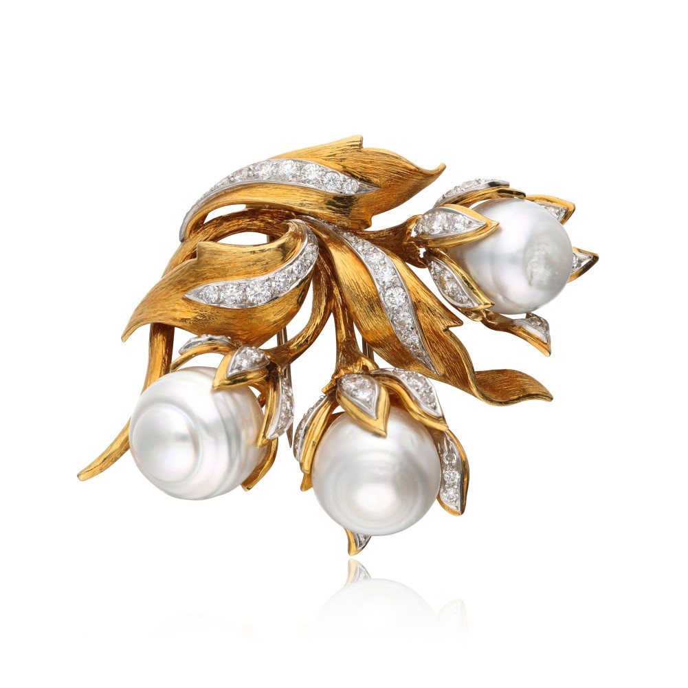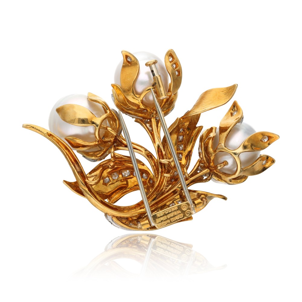 Composed of baroque cultured pearls and round brilliant-cut diamonds arranged in a floral spray.