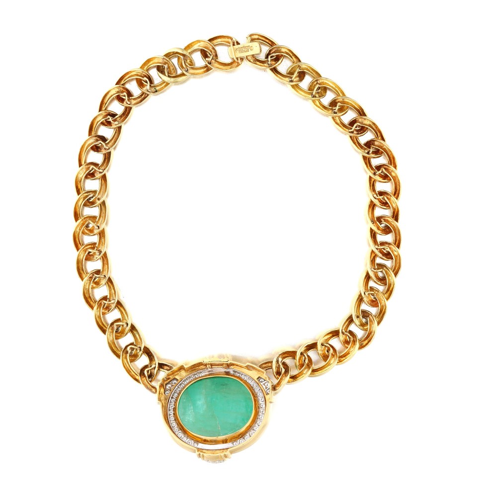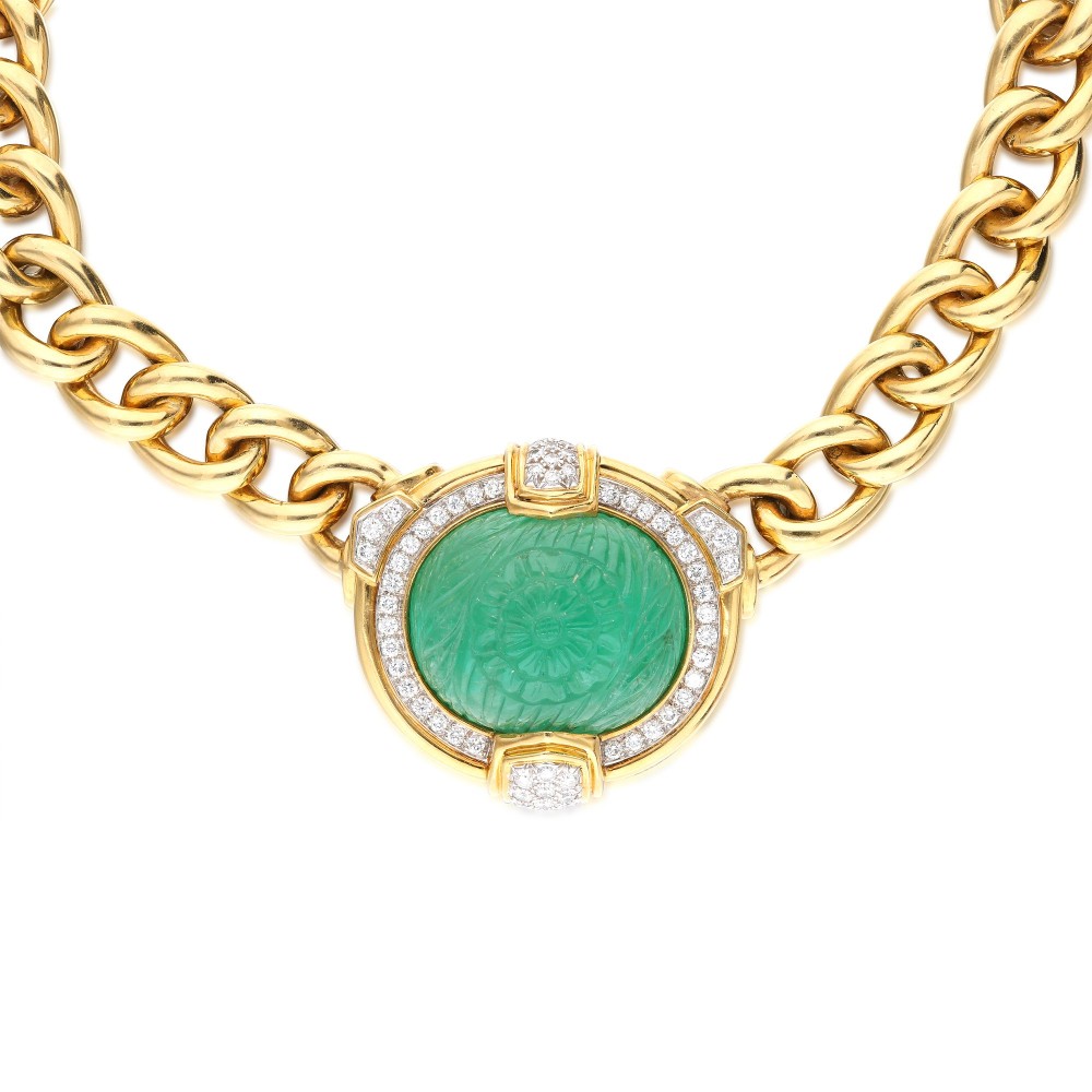 Centering a carved emerald cabochon and accented by round brilliant-cut diamonds.