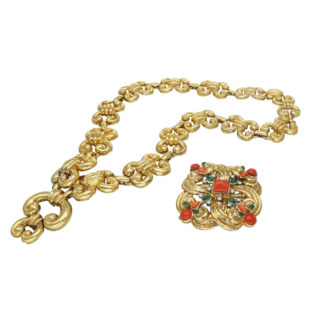 Composed of coral and emerald cabochons, accented by round brilliant-cut diamonds.