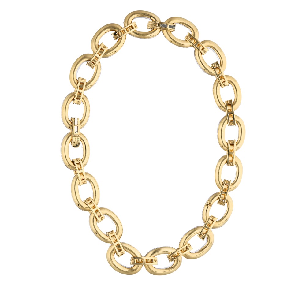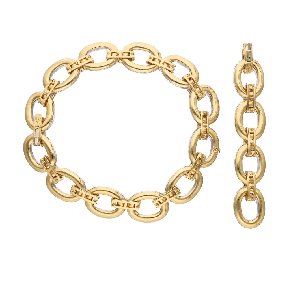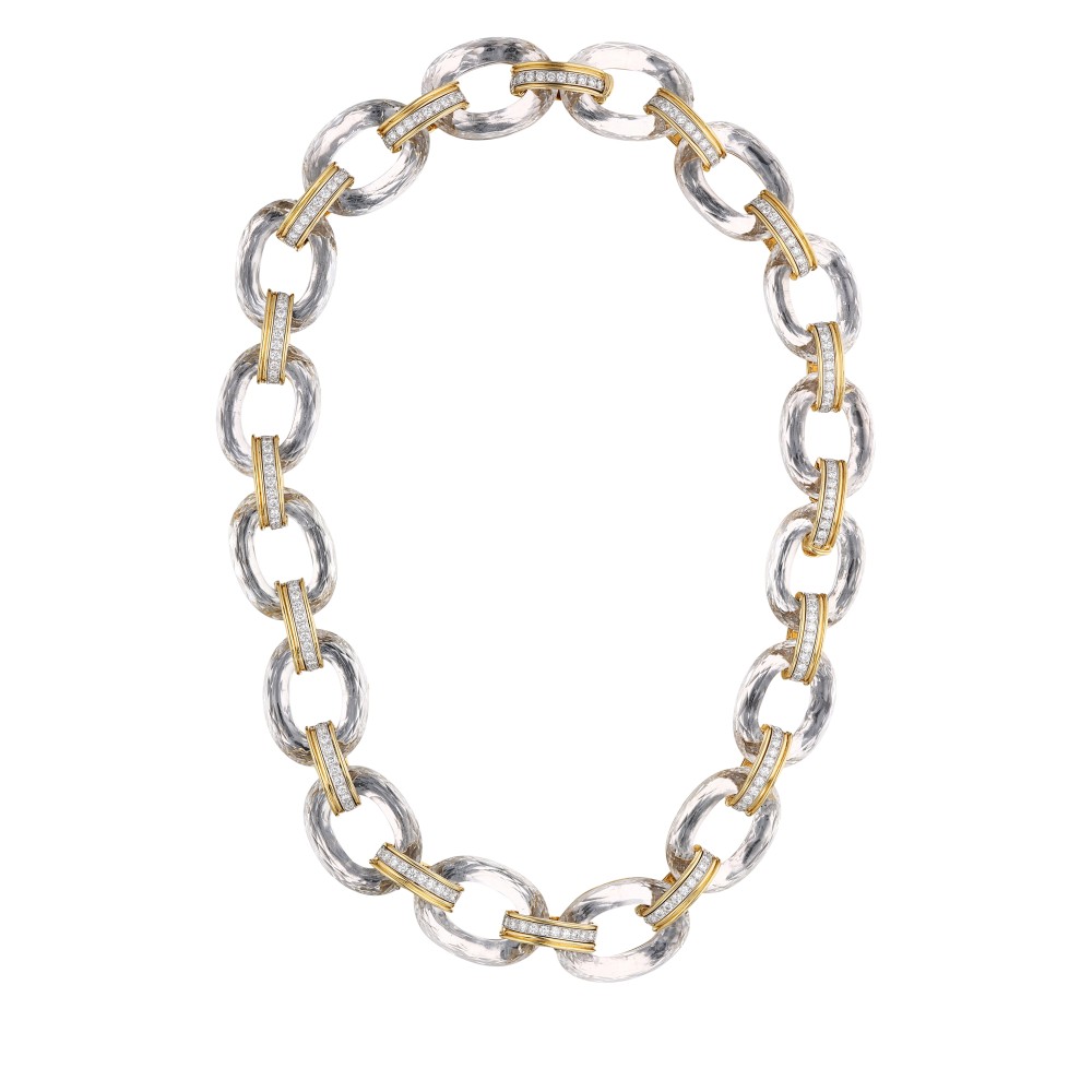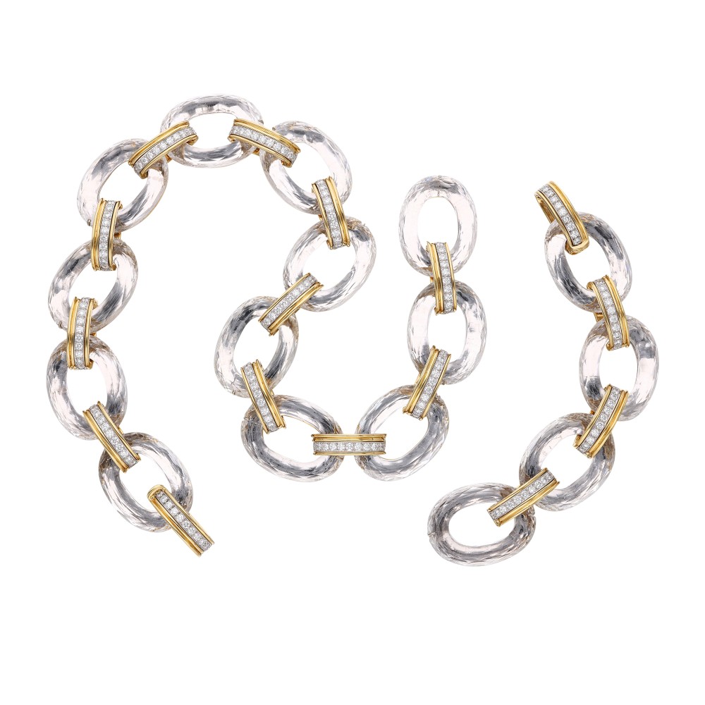 Composed of rock crystal quartz links interspaced by round brilliant-cut diamond-set links.