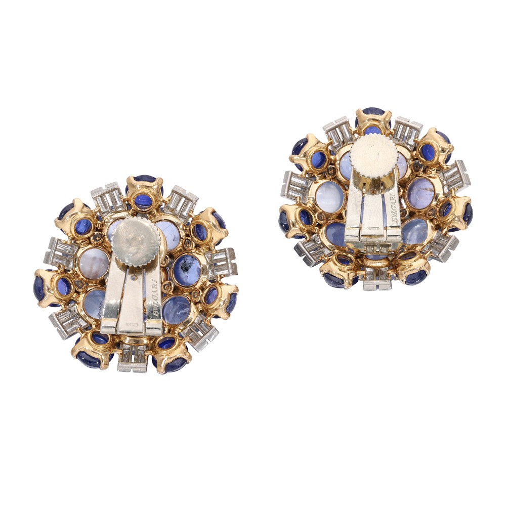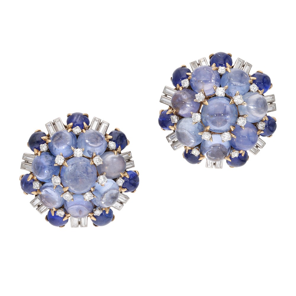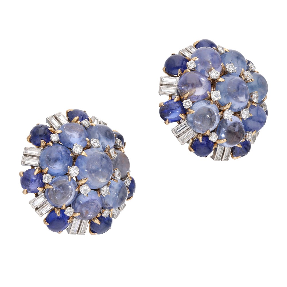 Composed of sapphire cabochons, accented by round brilliant and baguette-cut diamonds.