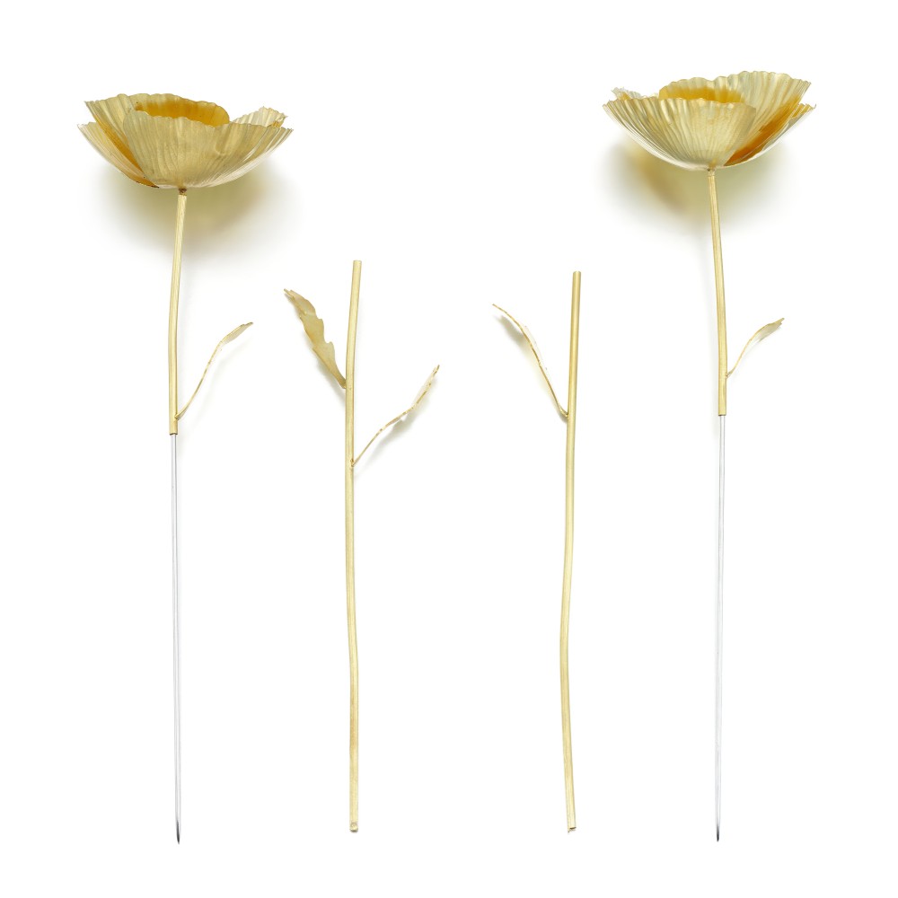 Handcrafted, both object and jewel, the flowerheads can be removed from each stem to become stud earrings, the stamens set with brilliant cut diamonds, or the lower stems removed to form a pair of brooches, the whole set in a walnut red lacquered base with a glass cloche.
