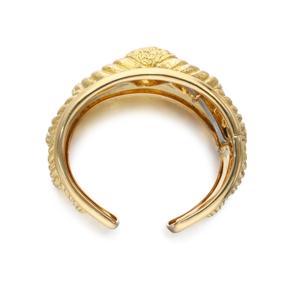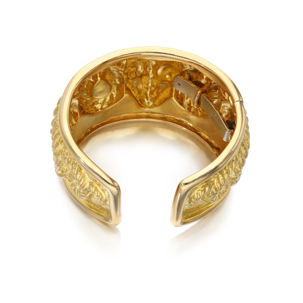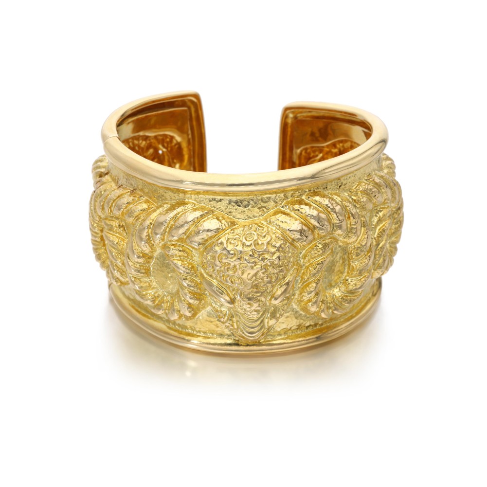 Composed of a relief pattern depicting a ram’s head in a high-polish gold finish.