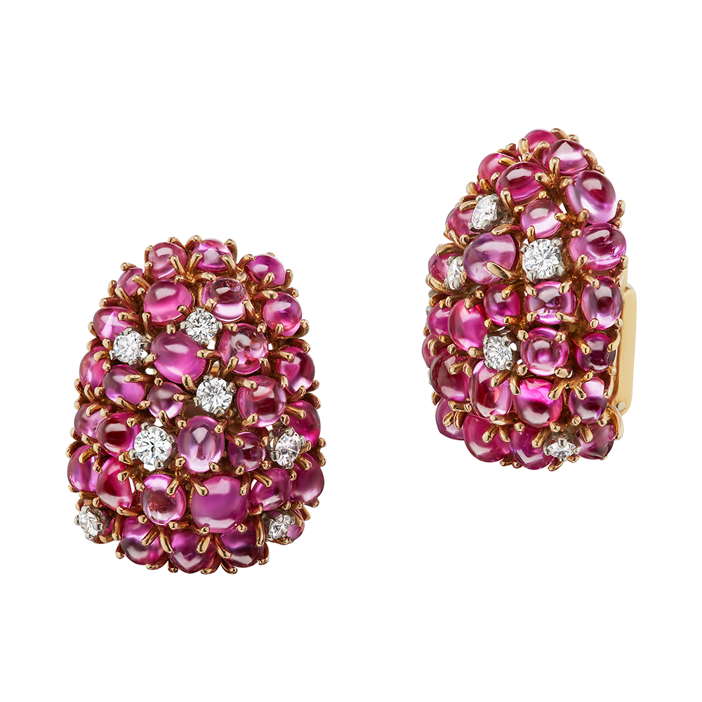 Set with 58 ruby cabochons, accented with 14 round brilliant cut diamonds.
