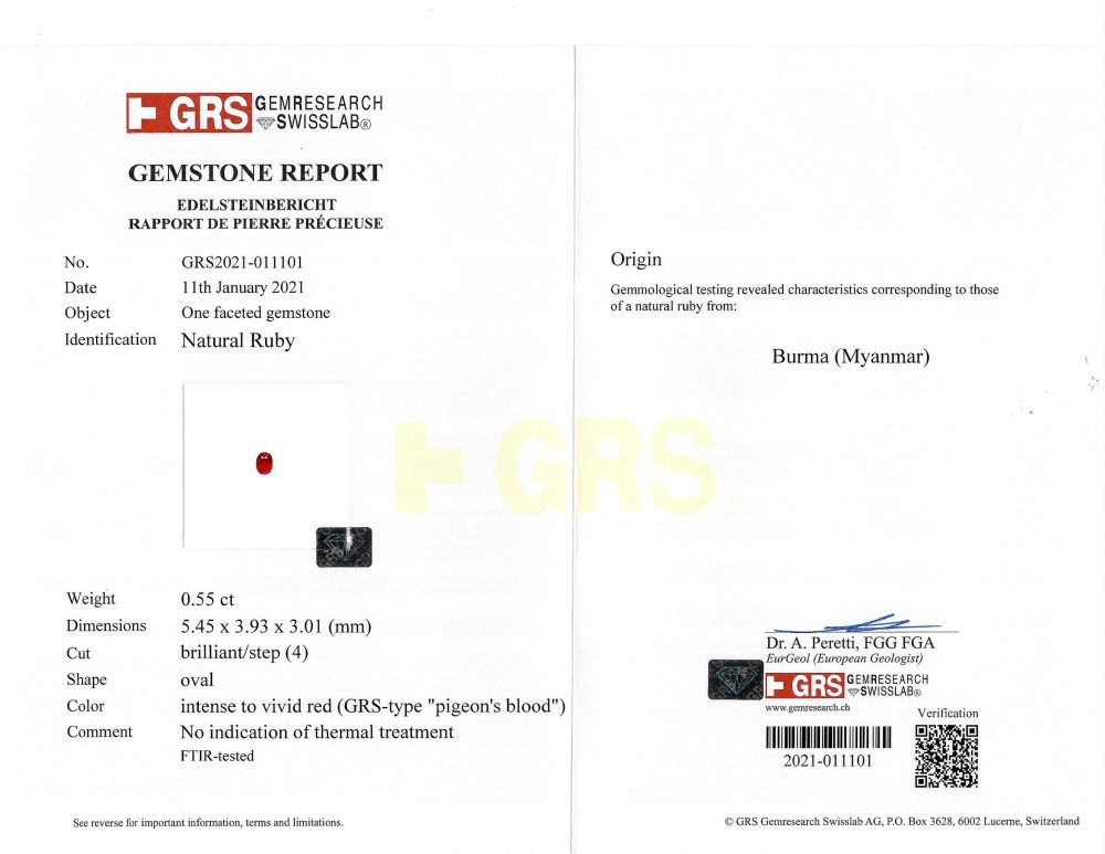 - Accompanied by GRS reports no. GRS2021-011101, dated January 11, 2021, stating that 0.55 carat natural ruby is intense to vivid red (GRS-type “pigeon’s blood”) color, originated from Burma (Myanmar) and no indication of thermal treatment