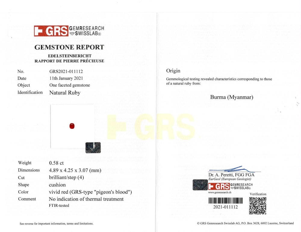 - Accompanied by GRS report no. GRS2021-011112, dated January 11, 2021, stating that 0.58 carat natural ruby is vivid red (GRS-type “pigeon’s blood”) color, originated from Burma (Myanmar) and no indication of thermal treatment