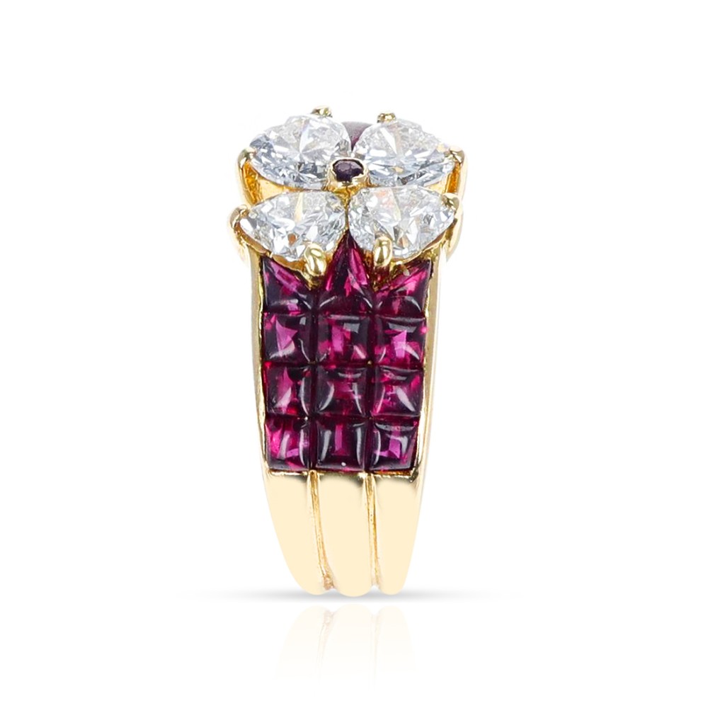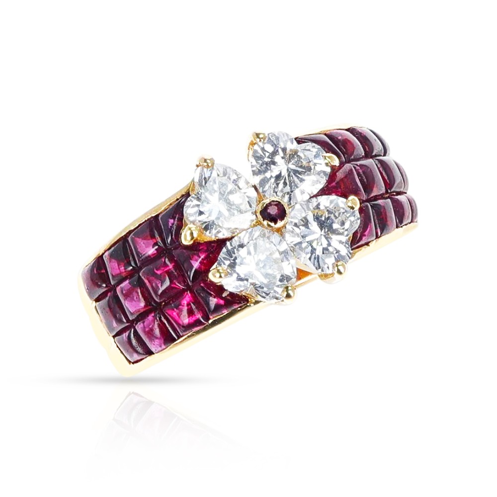 Centering 4 heart-shaped diamonds with a round ruby center, accented by mystery-set ruby cabochons.