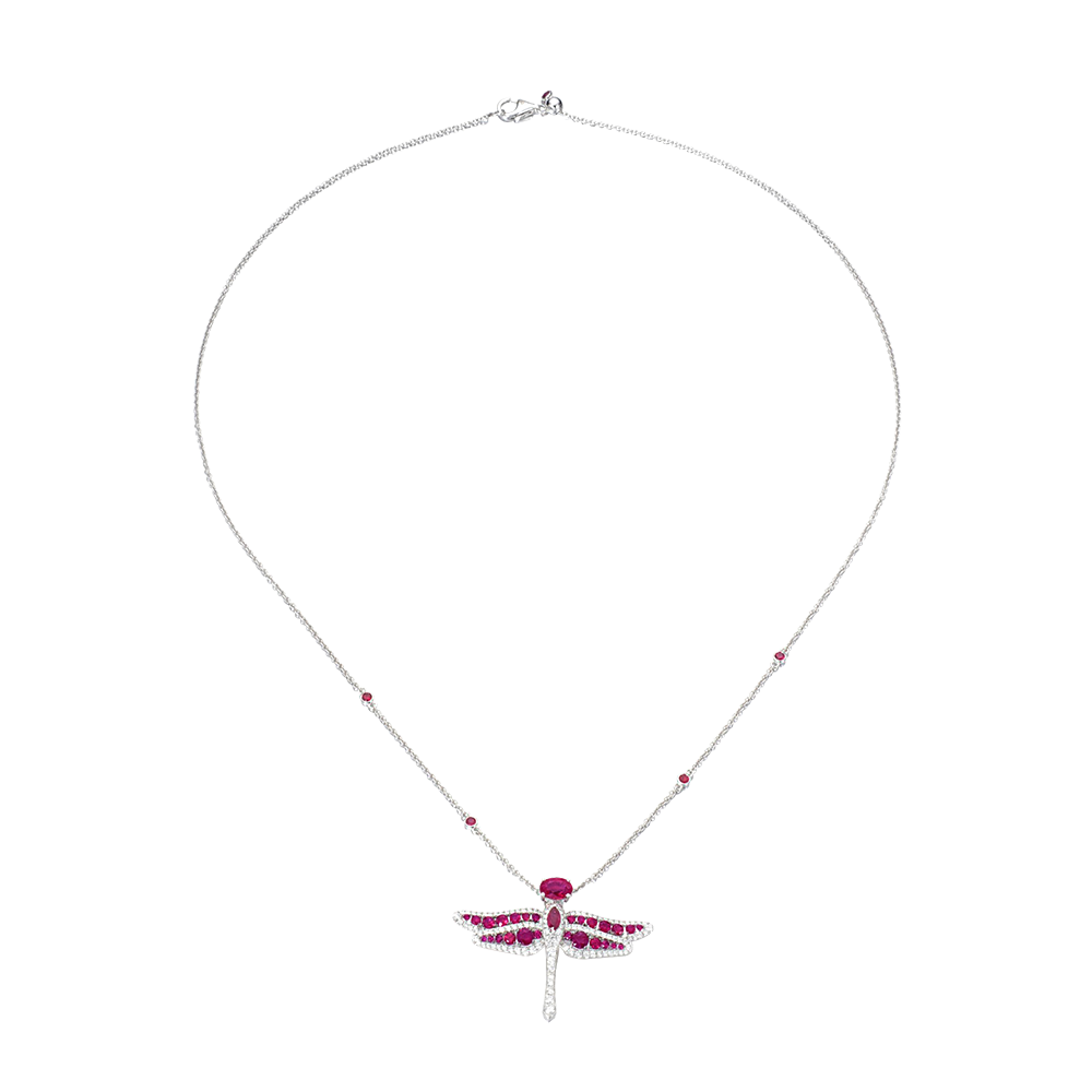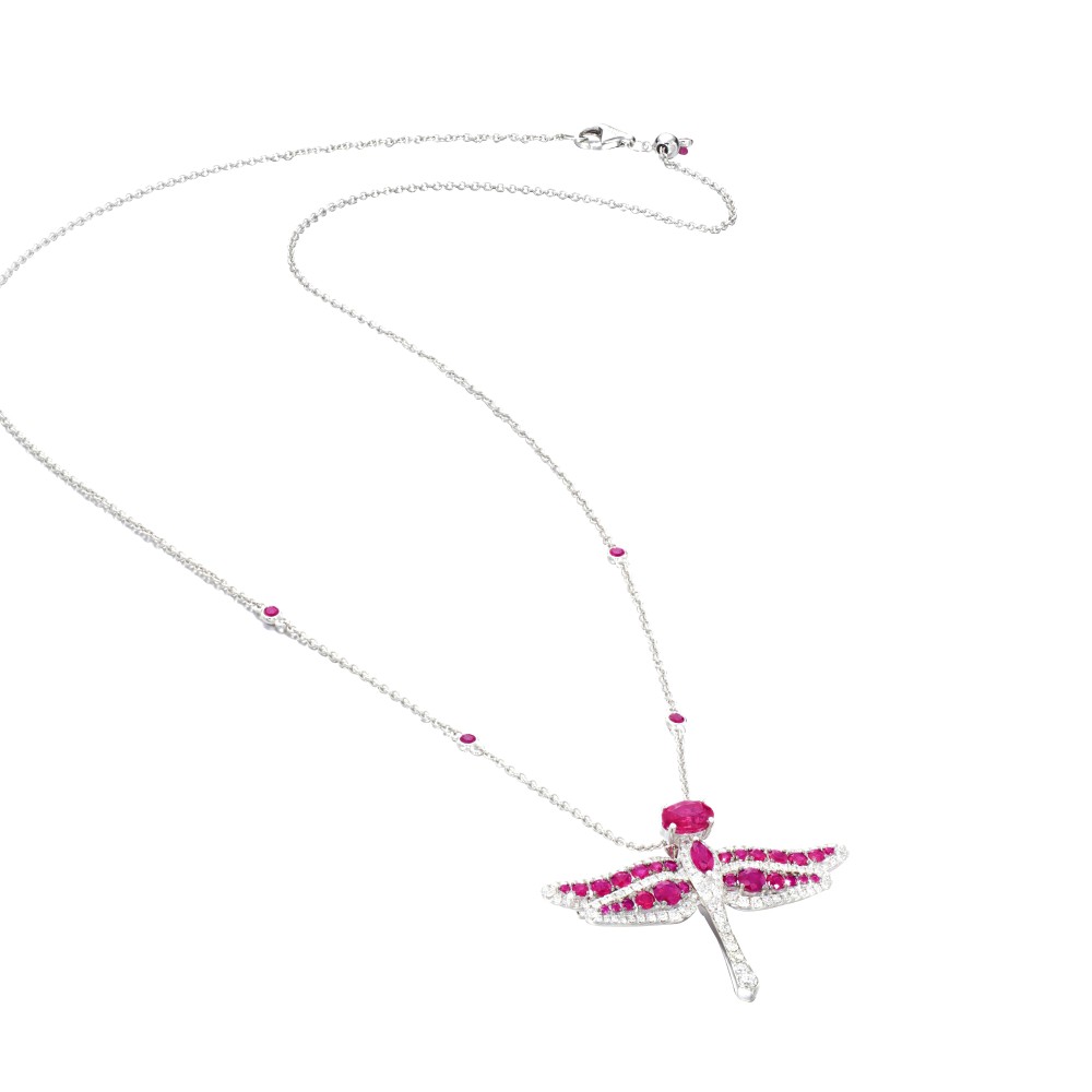 Designed as a dragonfly, set with oval, marquise- and circular-cut rubies and brilliant-cut diamonds, pendant detachable and may be worn as a brooch.