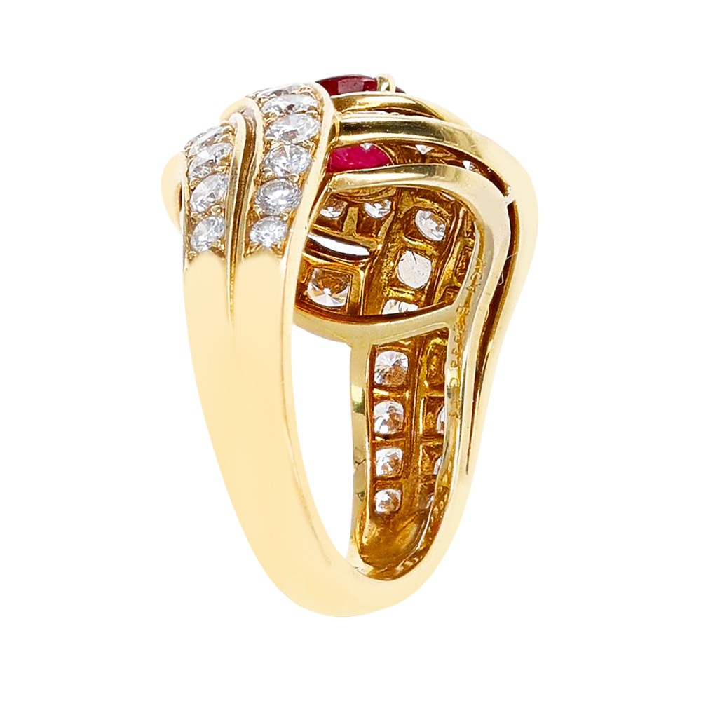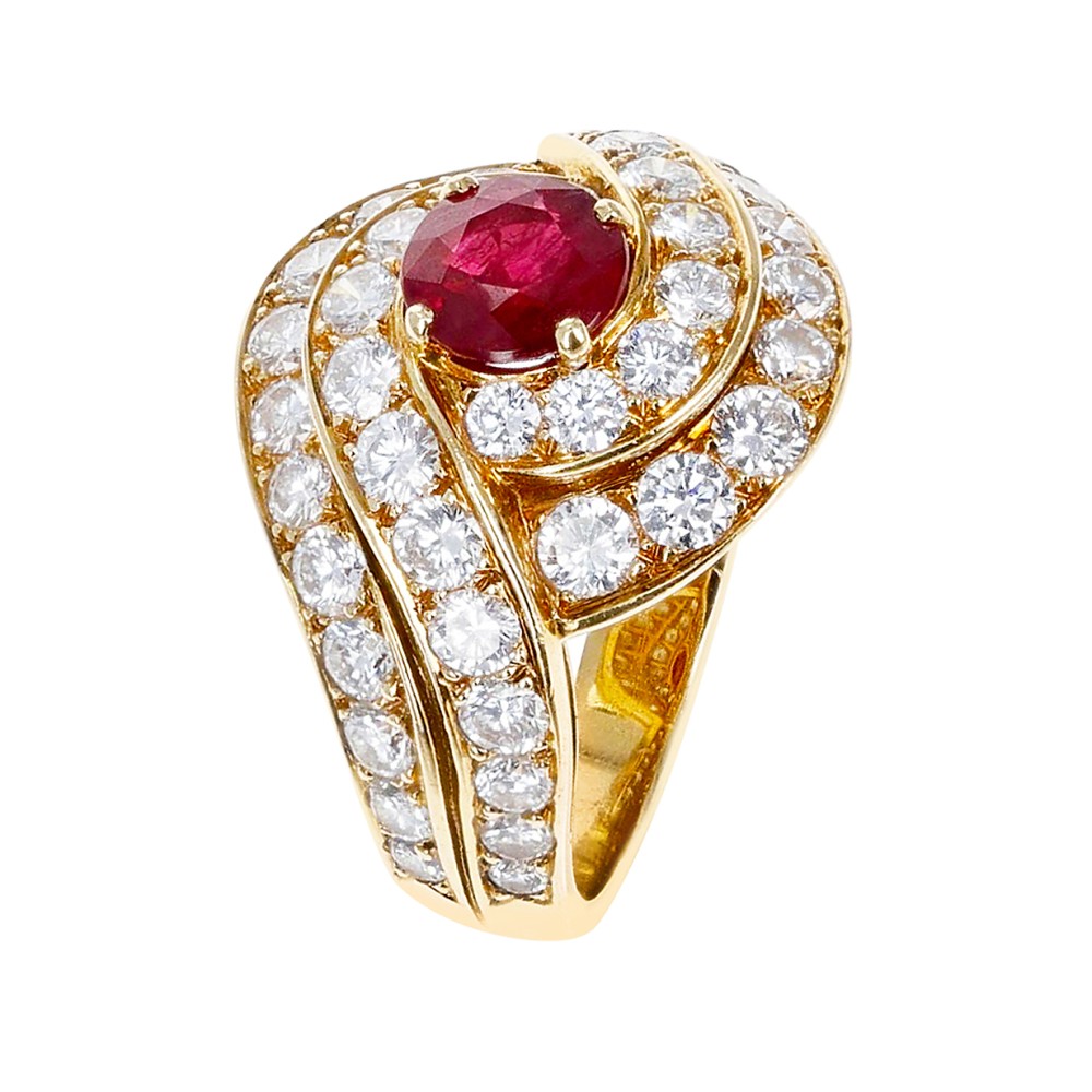 Centering a round ruby, surrounded by 4 rows of round diamonds.