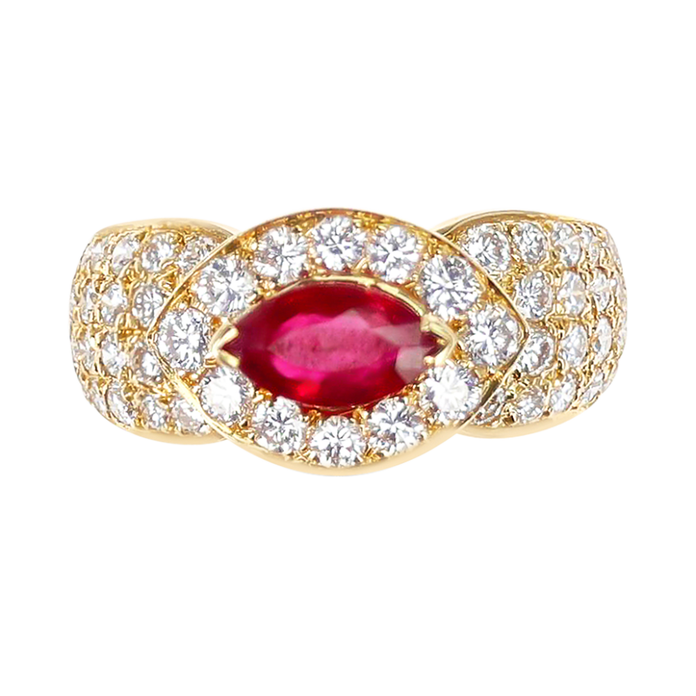 Centering a marquise-shaped ruby, surrounded by round diamonds, accented by additional round diamonds on shank.