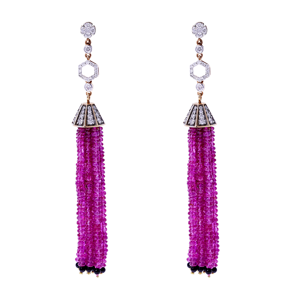 Designed as a tassel, composed of ruby beads, onyx beads and round diamonds.