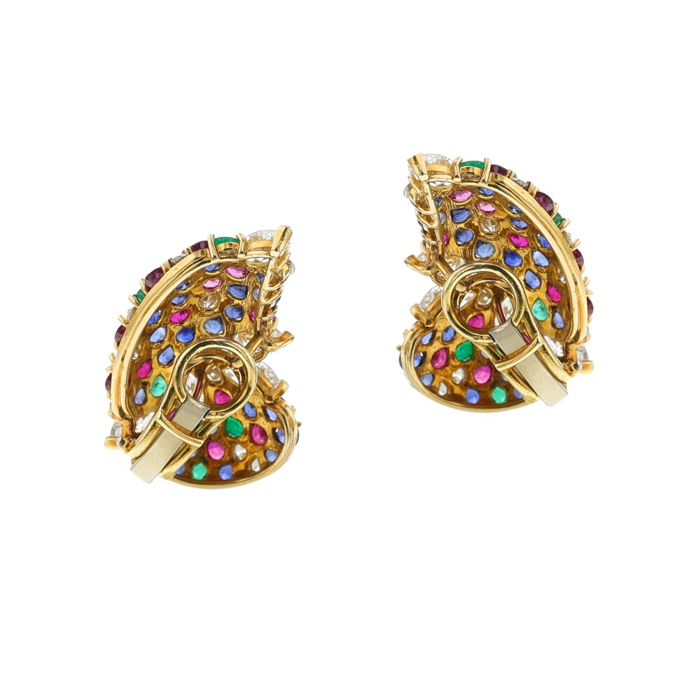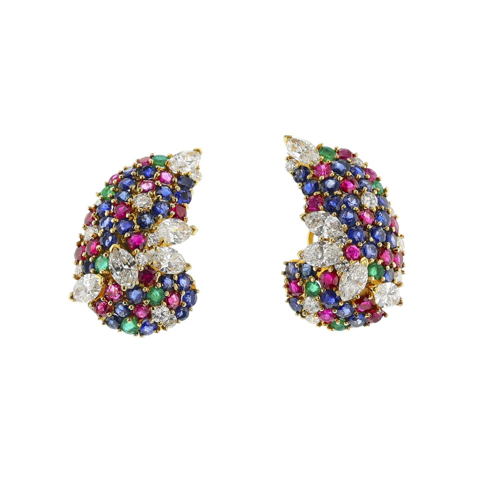 Each set with marquise-cut diamonds, round brilliant-cut diamonds and round rubies, sapphires and emeralds.