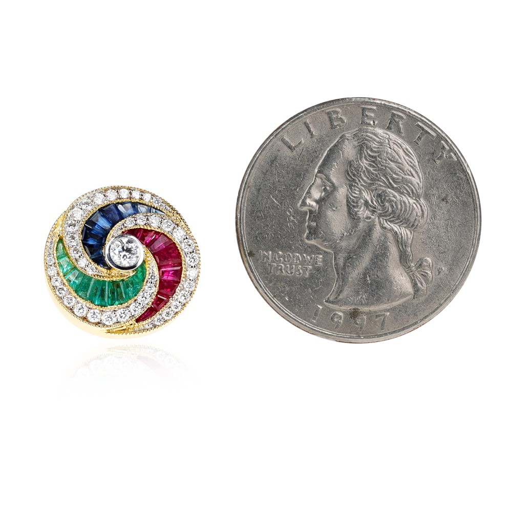 Of a pinwheel motif, centering a round brilliant-cut diamond on each with calibr?-cut rubies, sapphires and emeralds, accented by round brilliant-cut diamonds.