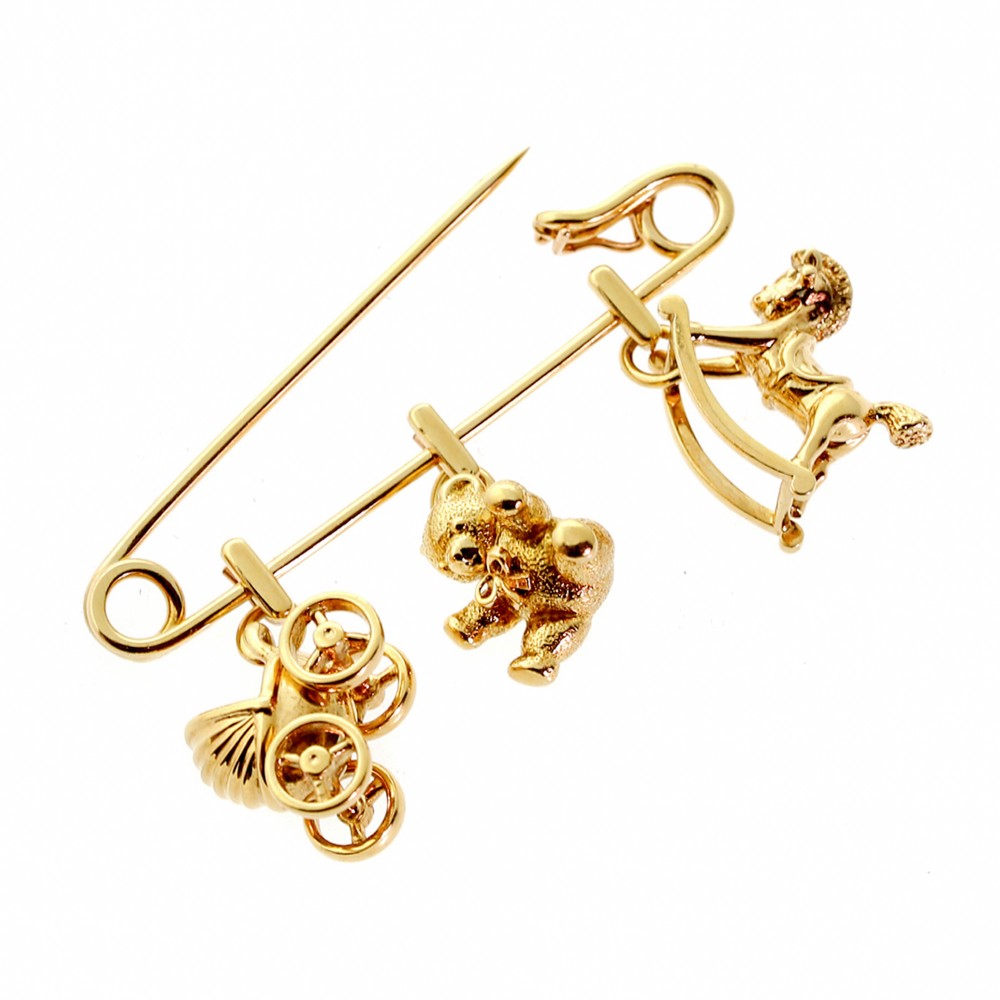 The brooch designed as a safety pin suspending a baby carriage, a teddy bear and a hobby horse.