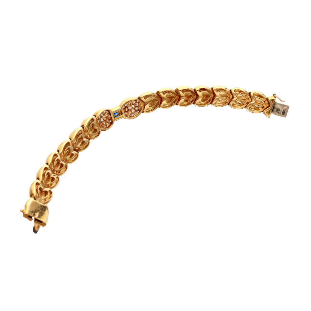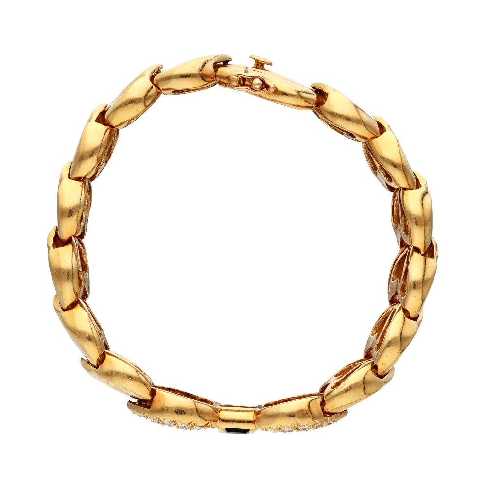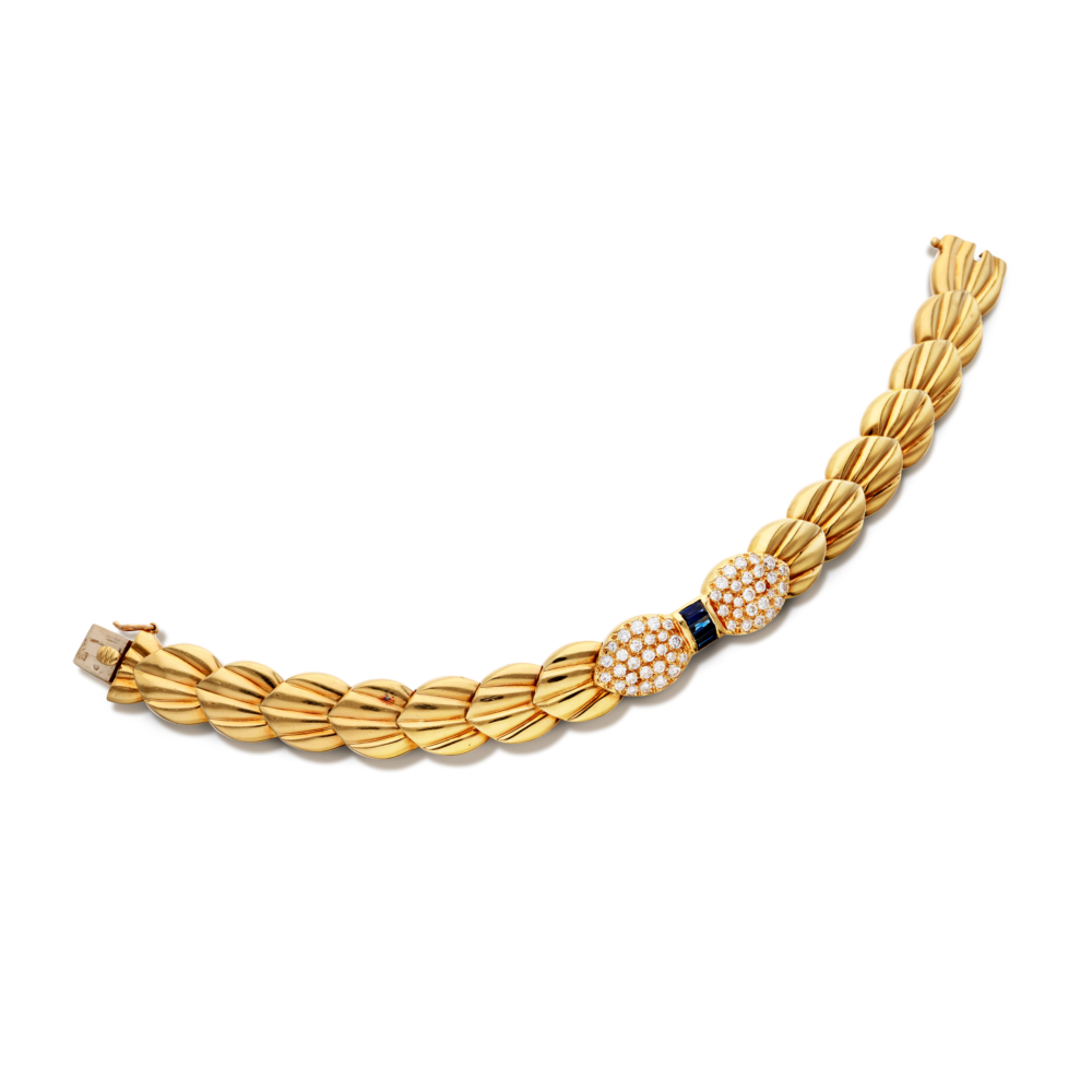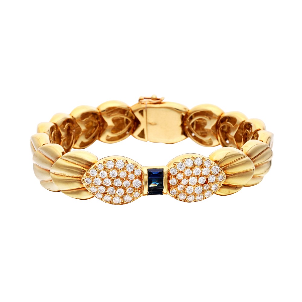 Of sculpted scallop design, centering a row of baguette-shaped sapphires, accented by 52 round brilliant cut diamonds.