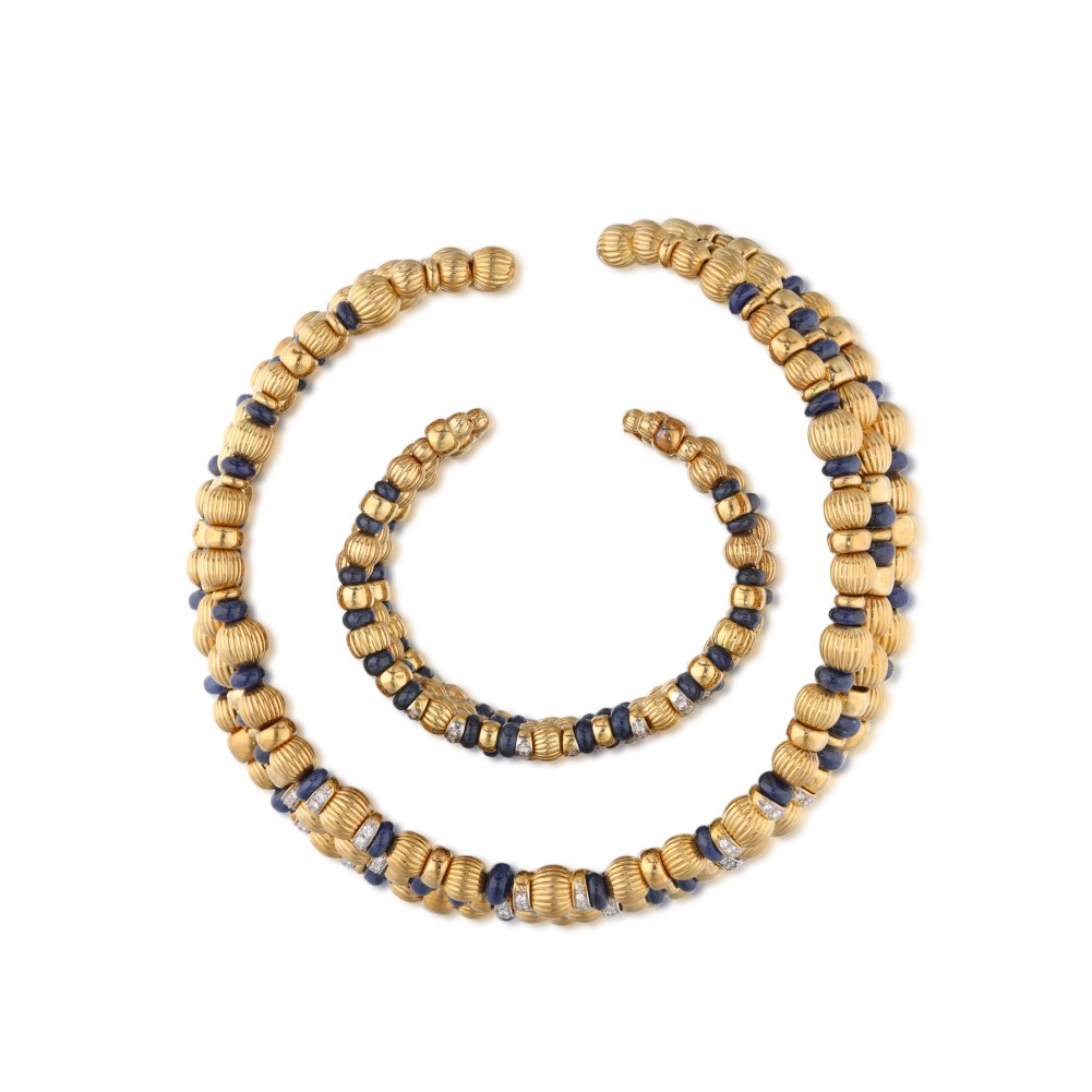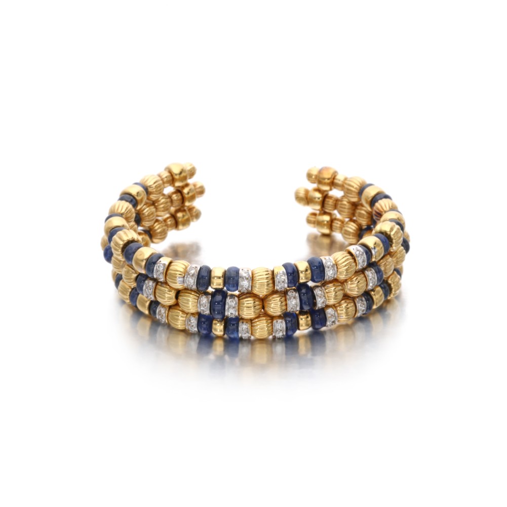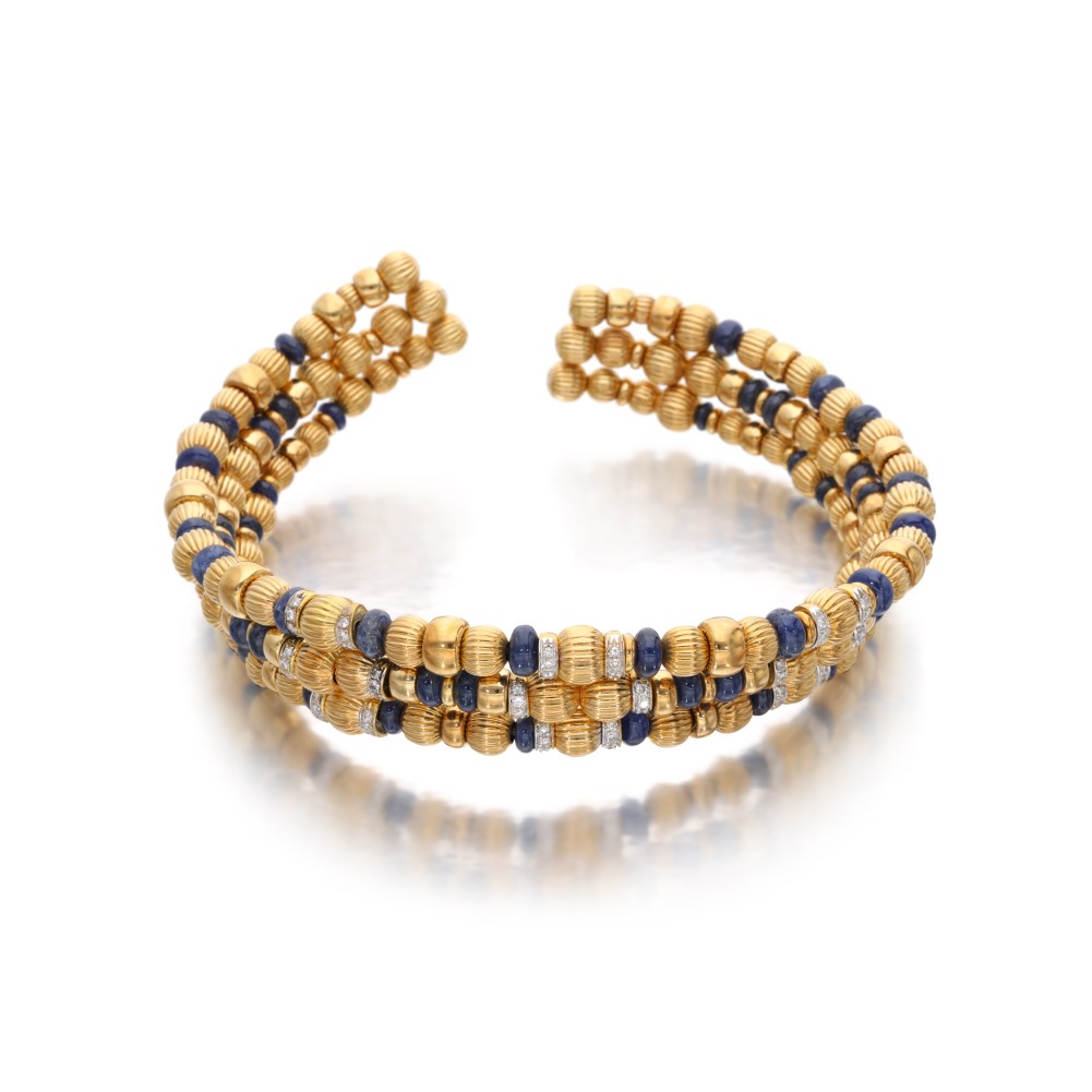 Composed of round brilliant-cut diamonds and sapphire beads interspaced by gold beads on a flexible collar and cuff bracelet.