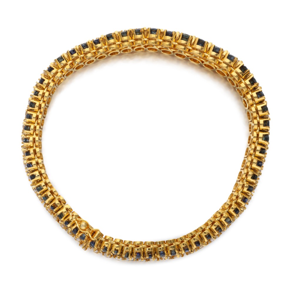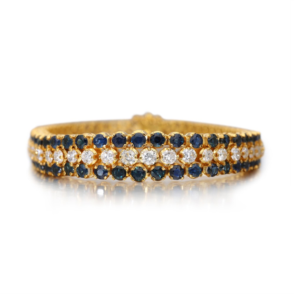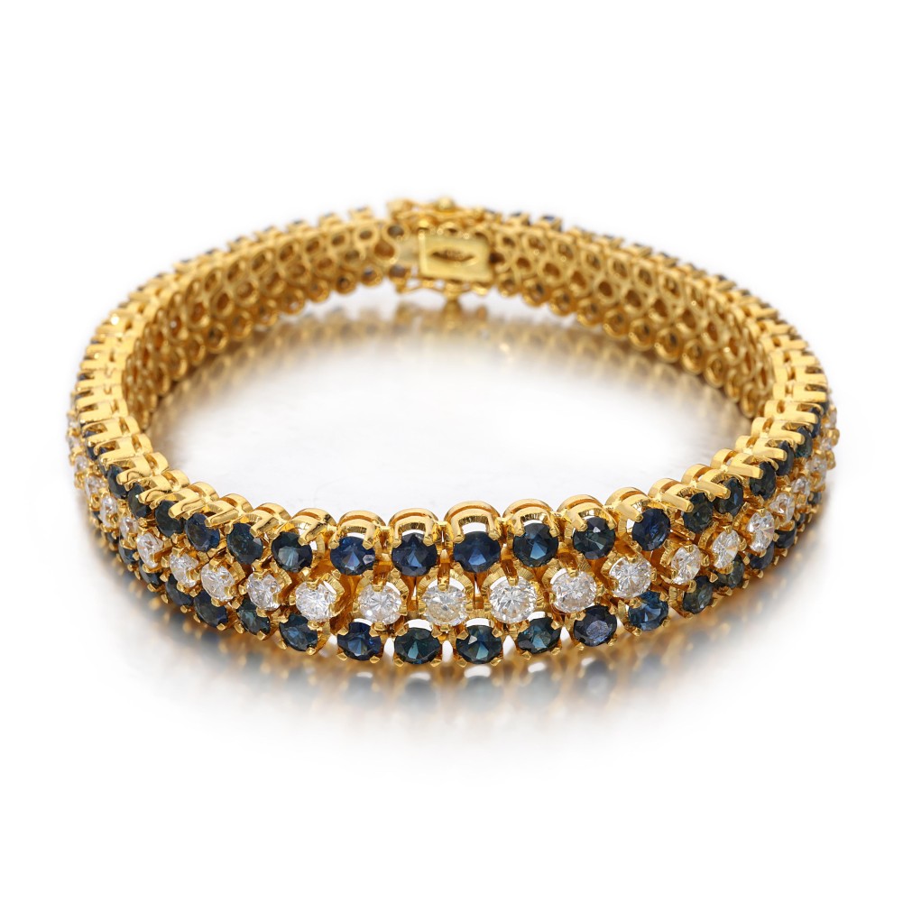Composed of round brilliant-cut diamonds and accented by round-cut sapphires.