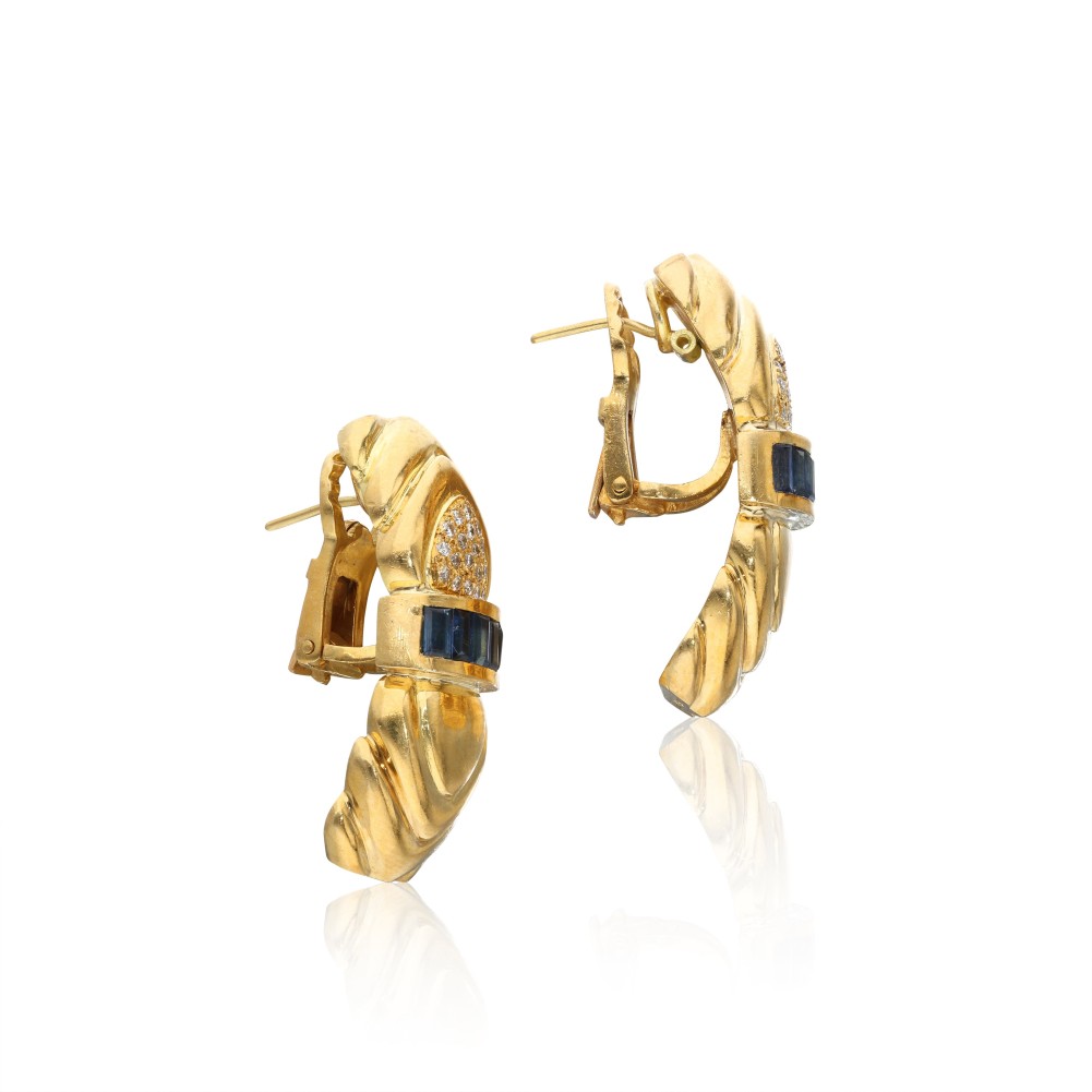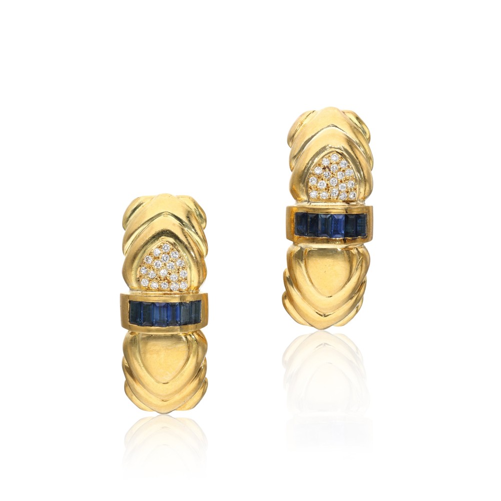 Composed of baguette-cut sapphires and round brilliant-cut diamonds.