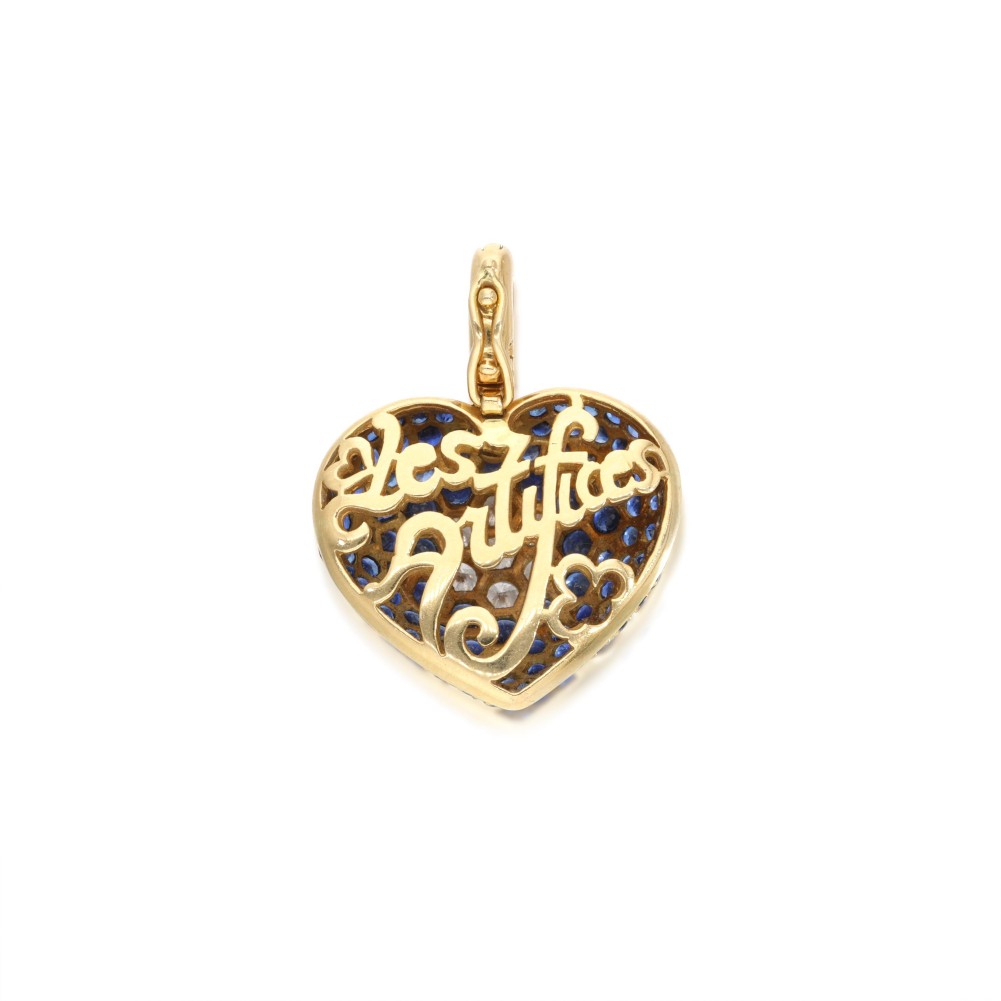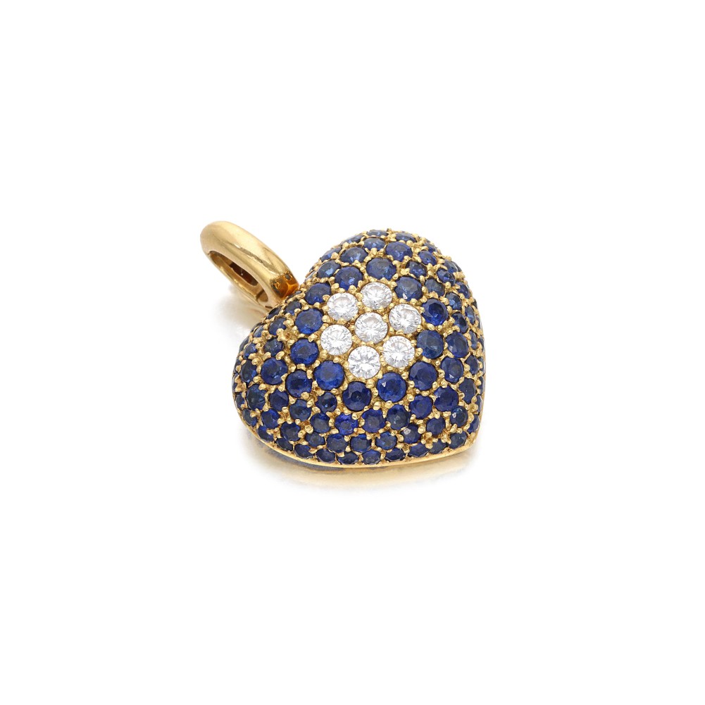 Composed of round-cut sapphires and round brilliant-cut diamonds arranged as a heart.